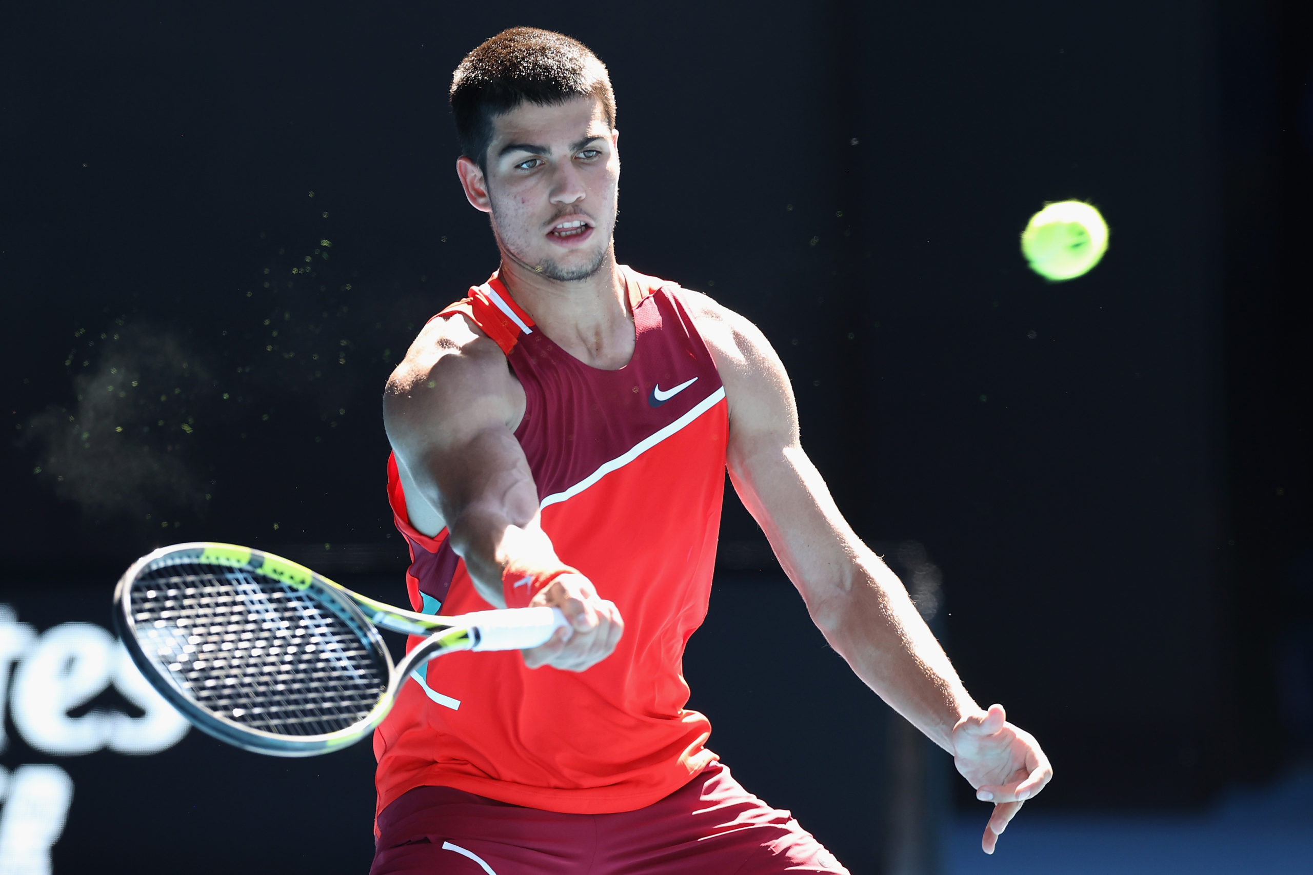 Carlos ALCARAZ (ESP) plays a forehand during Round 3 of the Australian Open on Rod Laver Arena at Melbourne Park in Melbourne on Friday, January 21, 2022. MANDATORY PHOTO CREDIT Rob Prezioso/TENNIS AUSTRALIA