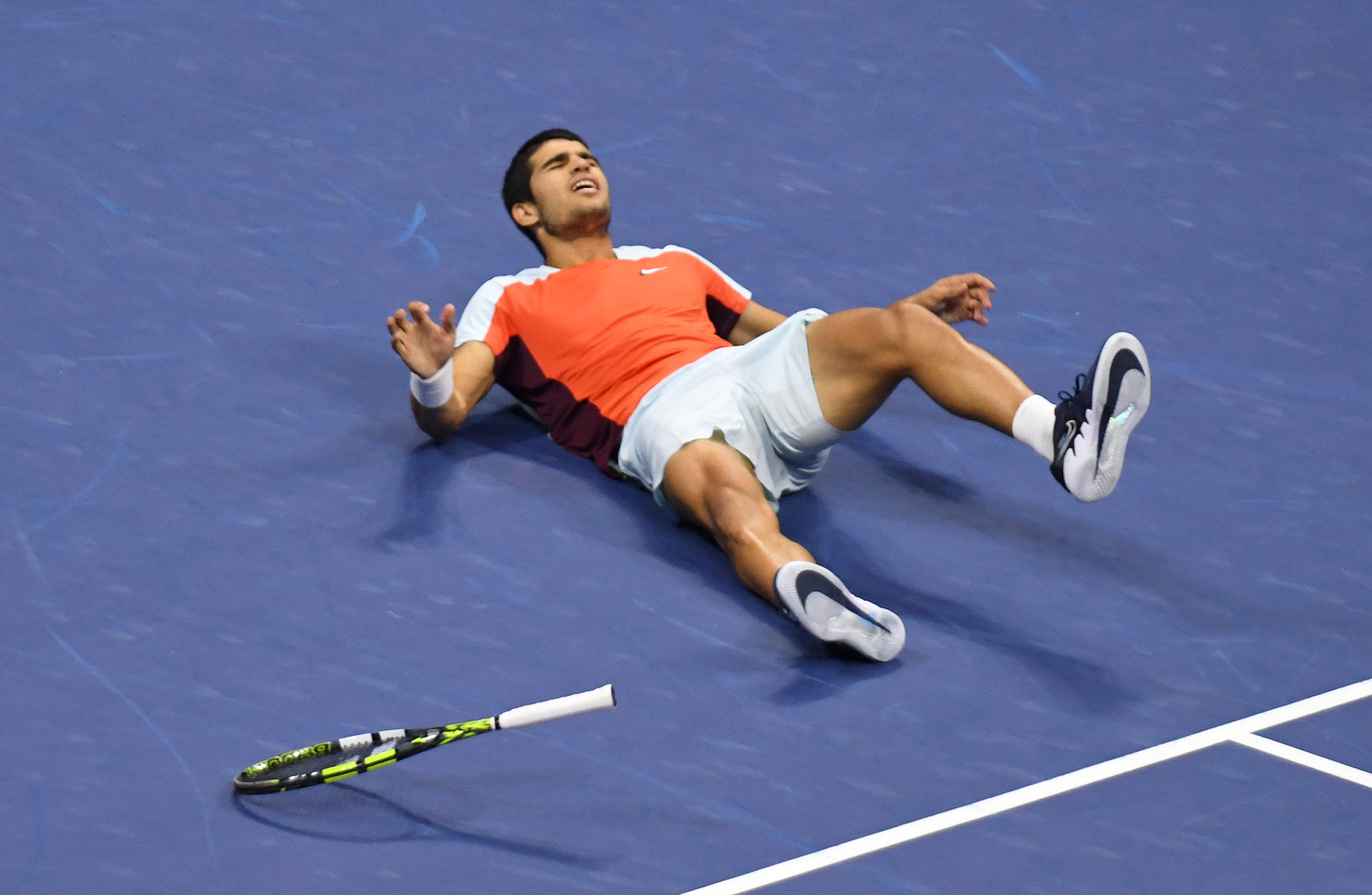 Victory for the heir to Rafael Nadal left the youngster stunned, falling flat on his back on the court when the contest ended.