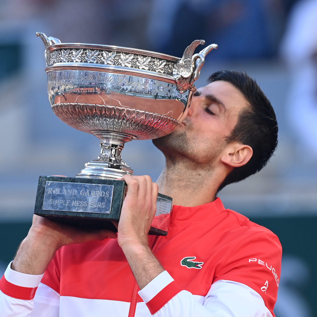 Main photo:- Novak Djokovic lifts French Open trophy Coupe des Mousquetaires 2021 wearing his Lacoste branding – by Roger Parker International Sports Fotos Ltd
