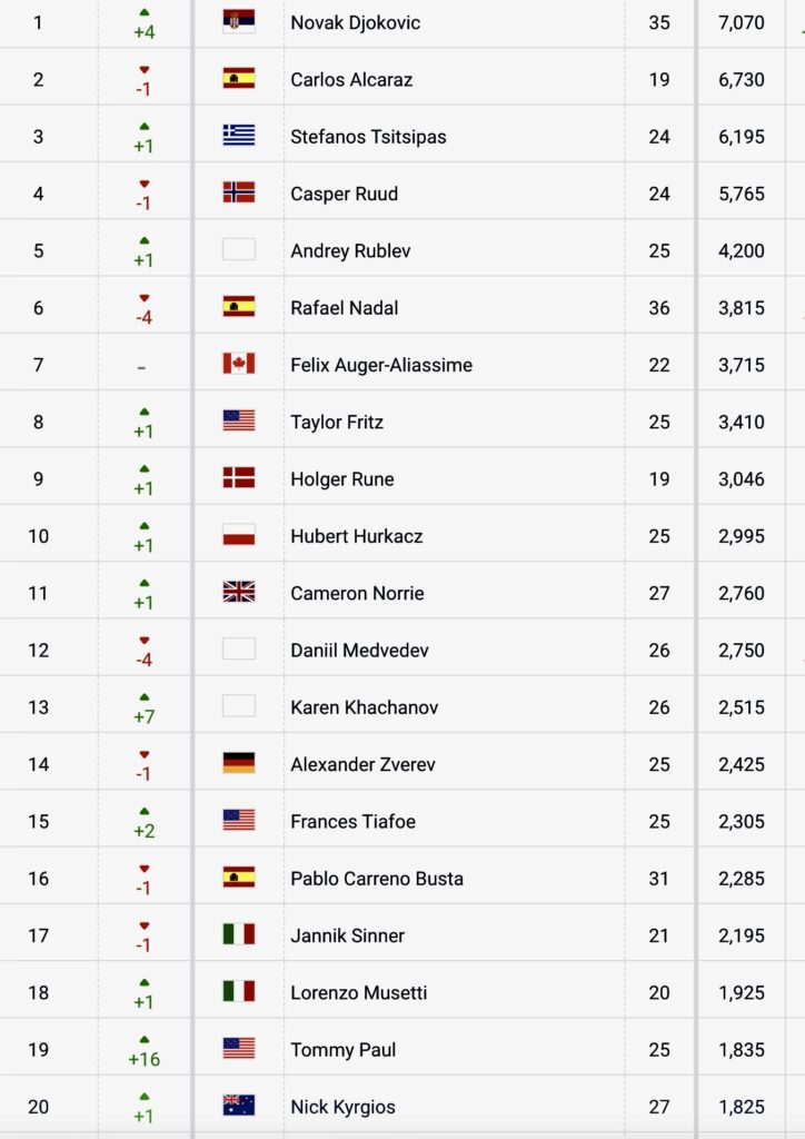 ATP latest rankings by ©Pepperstone