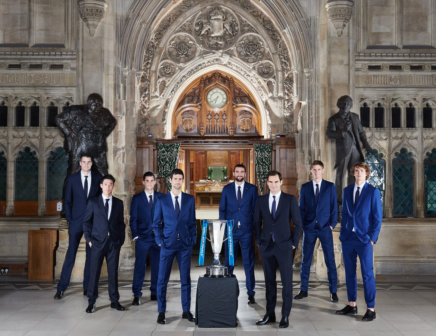 The eight singles players competing at the Nitto ATP Finals come together at London's iconic Houses of Parliament for the Nitto ATP Finals Official Launch presented by MoÎt & Chandon on November 9, 2018 in London, England.From left to right: John Isner, Kei Nishikori, Dominic Thiem, Novak Djokovic, Marin Cilic, Roger Federer, Kevin Anderson, Alexander Zverev.†The worldís biggest indoor tennis tournament will be played 11-18 November at The O2.