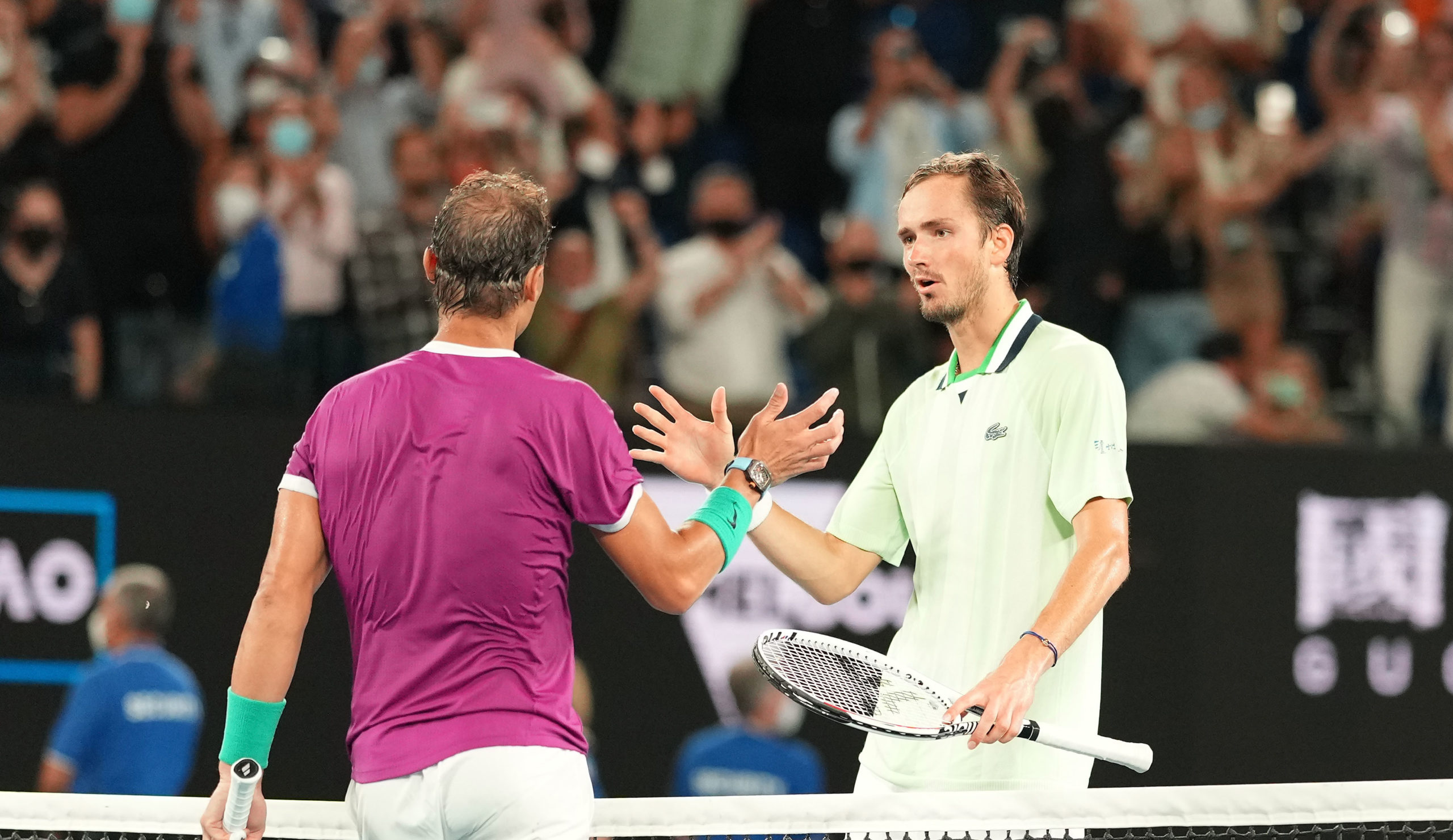 Rafael NADAL (ESP) and Daniil MEDVEDEV (RUS) after the Australian Open men’s singles final on Rod Laver Arena at Melbourne Park in Melbourne on Sunday, January 30, 2022. MANDATORY PHOTO CREDIT Scott Barbour/TENNIS AUSTRALIA