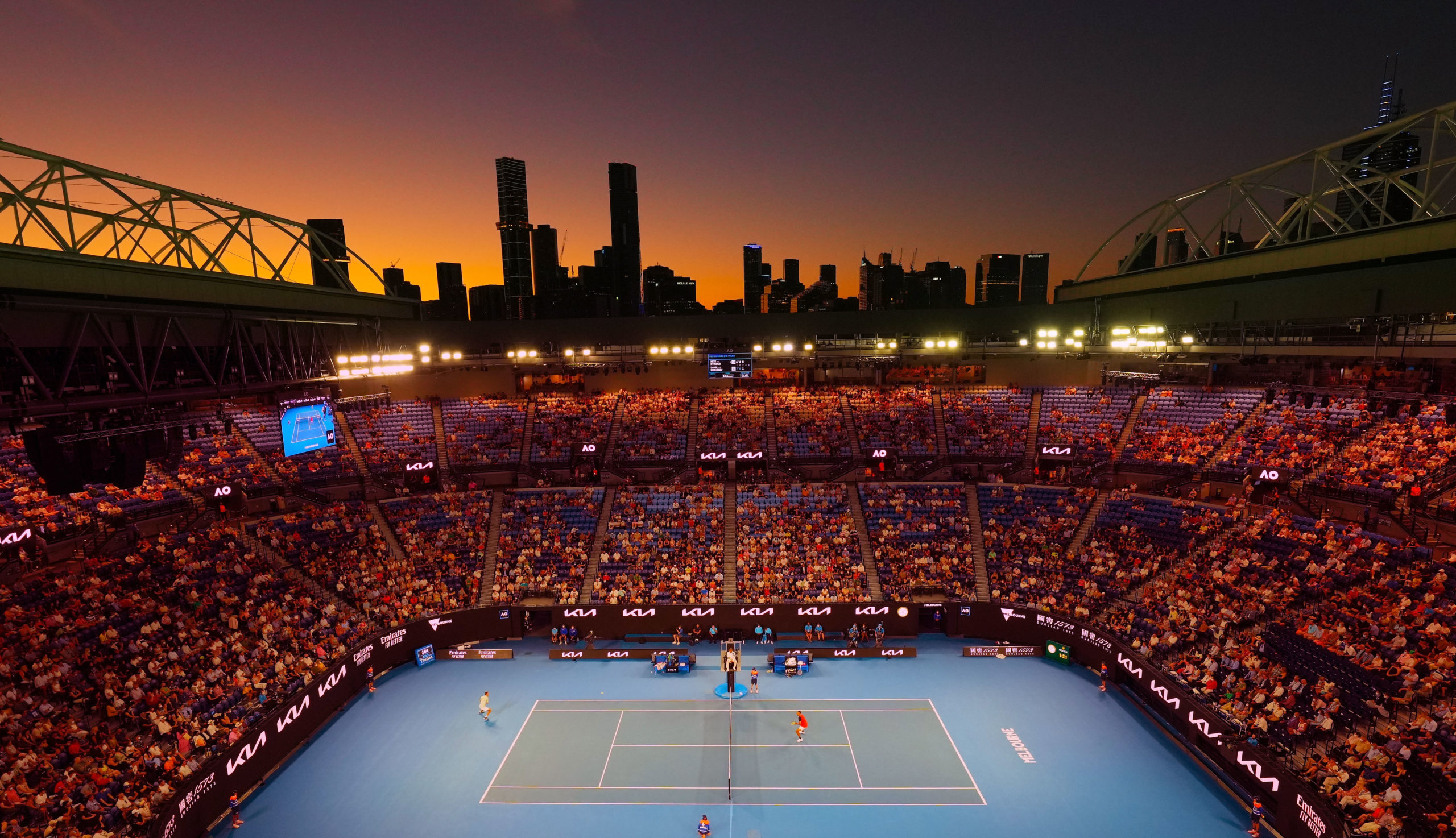 A general view at sunset during Round 2 of the Australian Open on Rod Laver Arena at Melbourne Park in Melbourne on Thursday, January 20, 2022. MANDATORY PHOTO CREDIT Scott Barbour/TENNIS AUSTRALIA