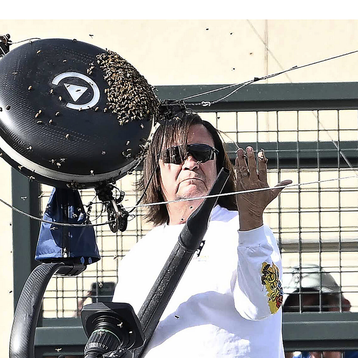Players, officials  and spectators vacated the court as thousands of bees settled on the overhead spider camera and beekeeper Lance Davis was summoned, who, without wearing any protective clothing managed to disperse them.