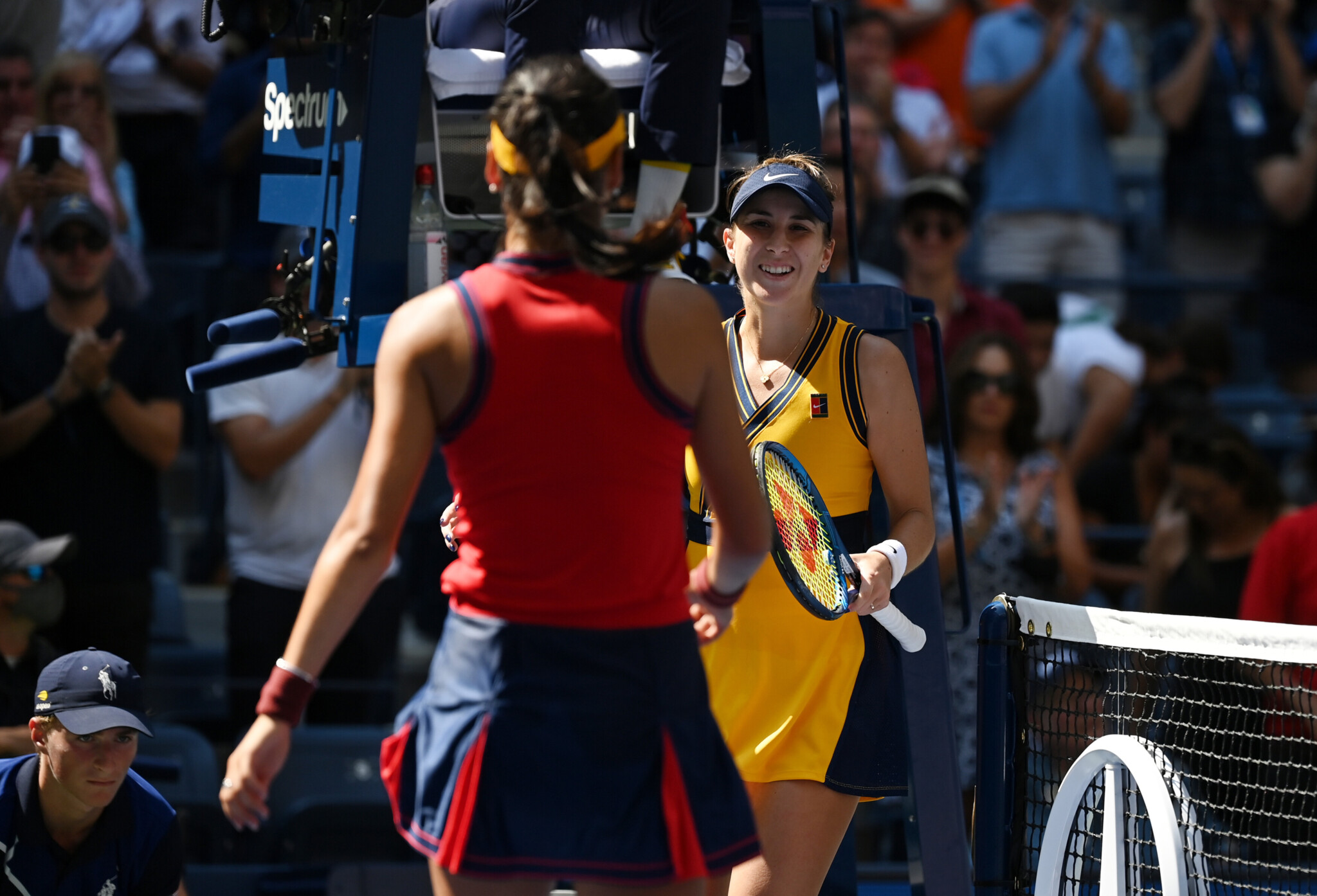 Belinda Bencic and Emma Raducanu meet at net after their Women's Singles quarterfinal match at the 2021 US Open, Wednesday, Sep. 8, 2021 in Flushing, NY. (Garrett Ellwood/USTA)