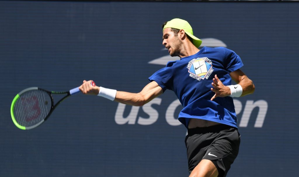 Karen Khachanov practices on Arthur Ashe Court with Rafa Nadal. Photo Roger Parker International Sports Fotos Ltd