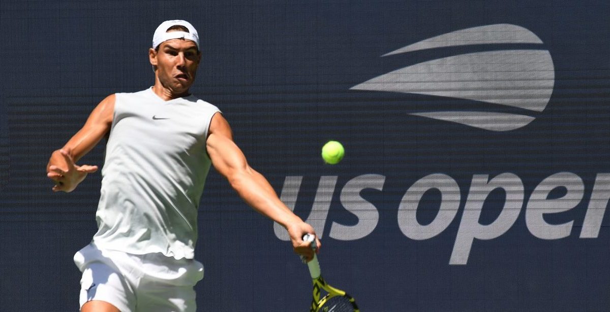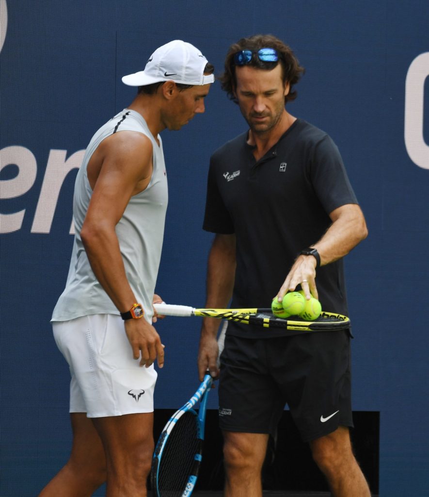 Rafa Nadal and coach Carlos Moya practice on Arthur Ashe court with Karen Khachanov.  Photo Roger Parker International Sports Fotos Ltd