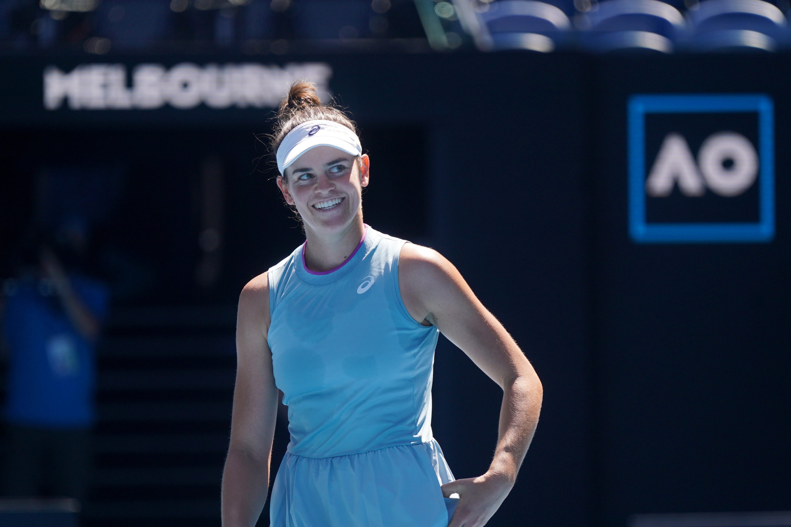 Jennifer BRADY (USA) reacts on winning her match on Rod Laver Arena during Day 8 of the Australian Open at Melbourne Park on Monday, February 15, 2021. MANDATORY PHOTO CREDIT Tennis Australia/ NATASHA MORELLO