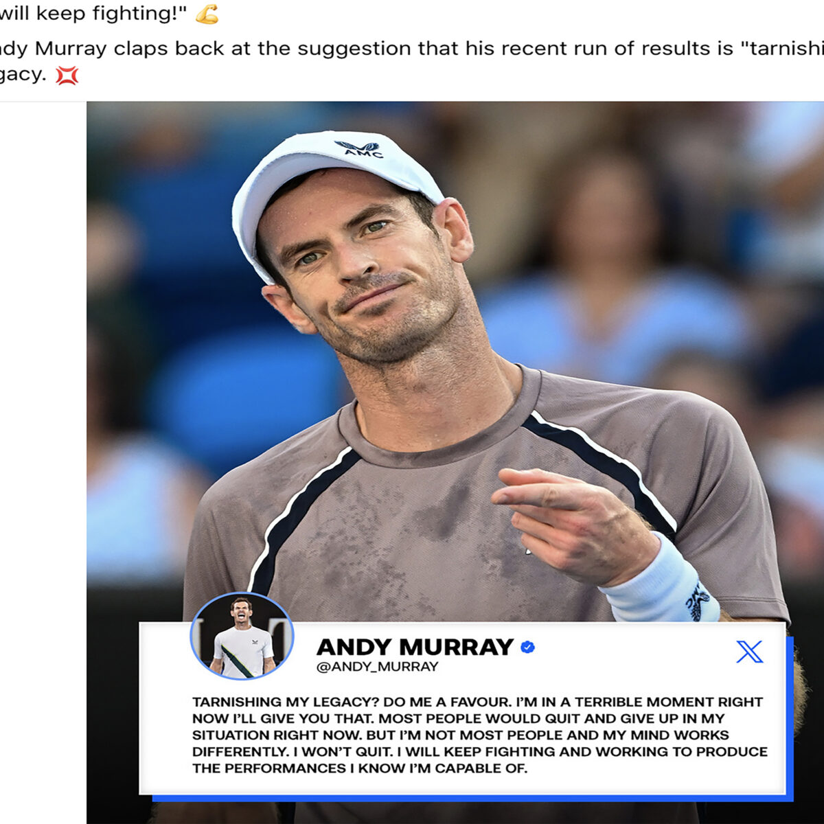Main photo:- Andy Murray fights back on “X” about calls to quit
