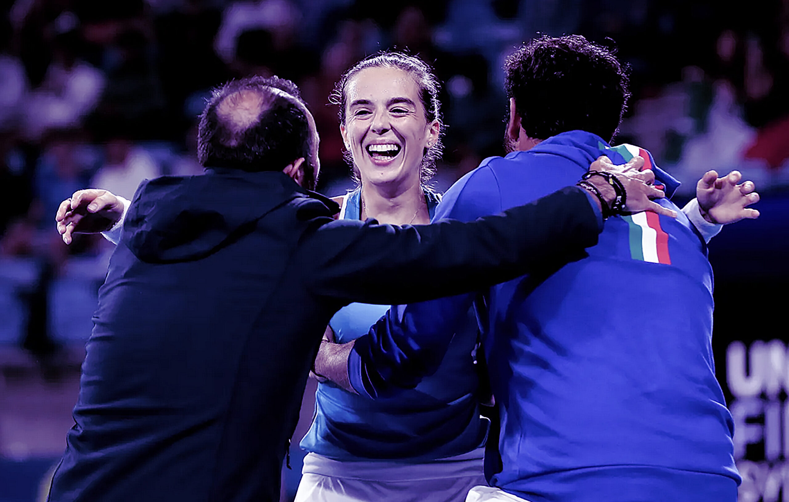Main photo:- Lucia Bronzetti celebrates with Italy teammates – by WTATennis.com