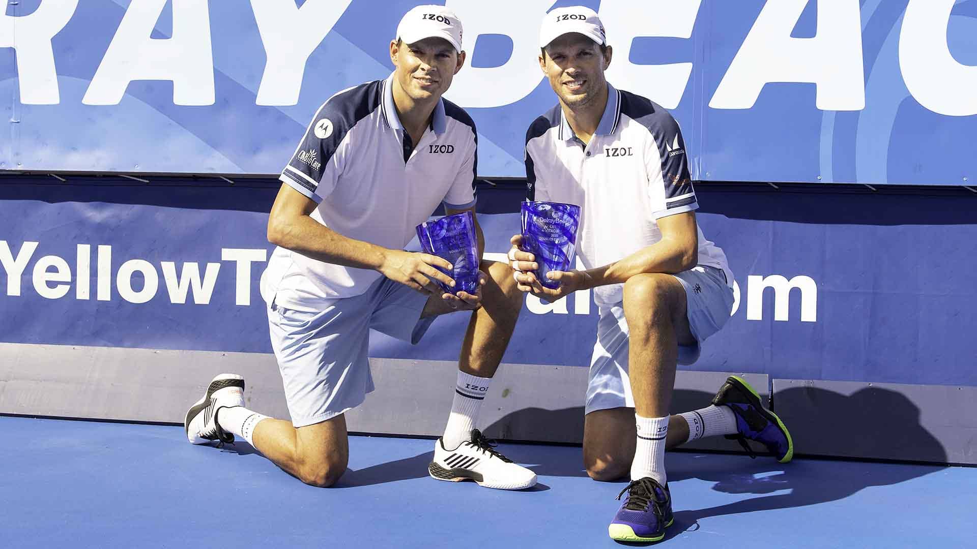 FEBRUARY 23 - Delray Beach: Bob and Mike Bryan(USA) celebrate after defeating Bambridge(GBR)/McLachlan(JPN) in the finals of the 2020 Delray Beach Open by Vitacost.com doubles championship held in Delray Beach, Florida.