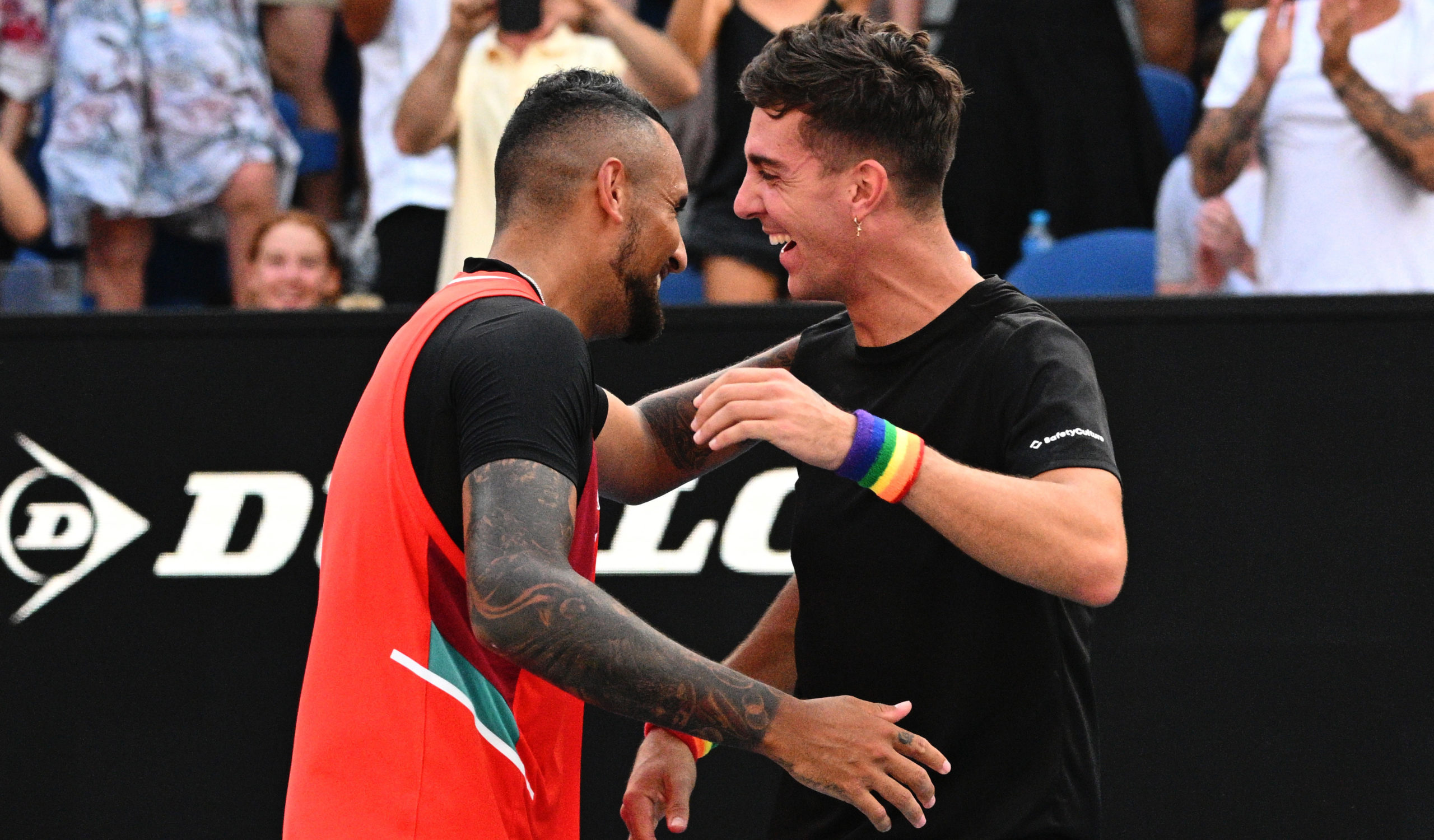 Nick KYRGIOS (AUS) and Thanasi KOKKINAKIS (AUS) hug at their doubles match during Round 3 of the Australian Open on Kia Arena at Melbourne Park in Melbourne on Sunday, January 23, 2022. MANDATORY PHOTO CREDIT Luis Enrique Ascui/TENNIS AUSTRALIA