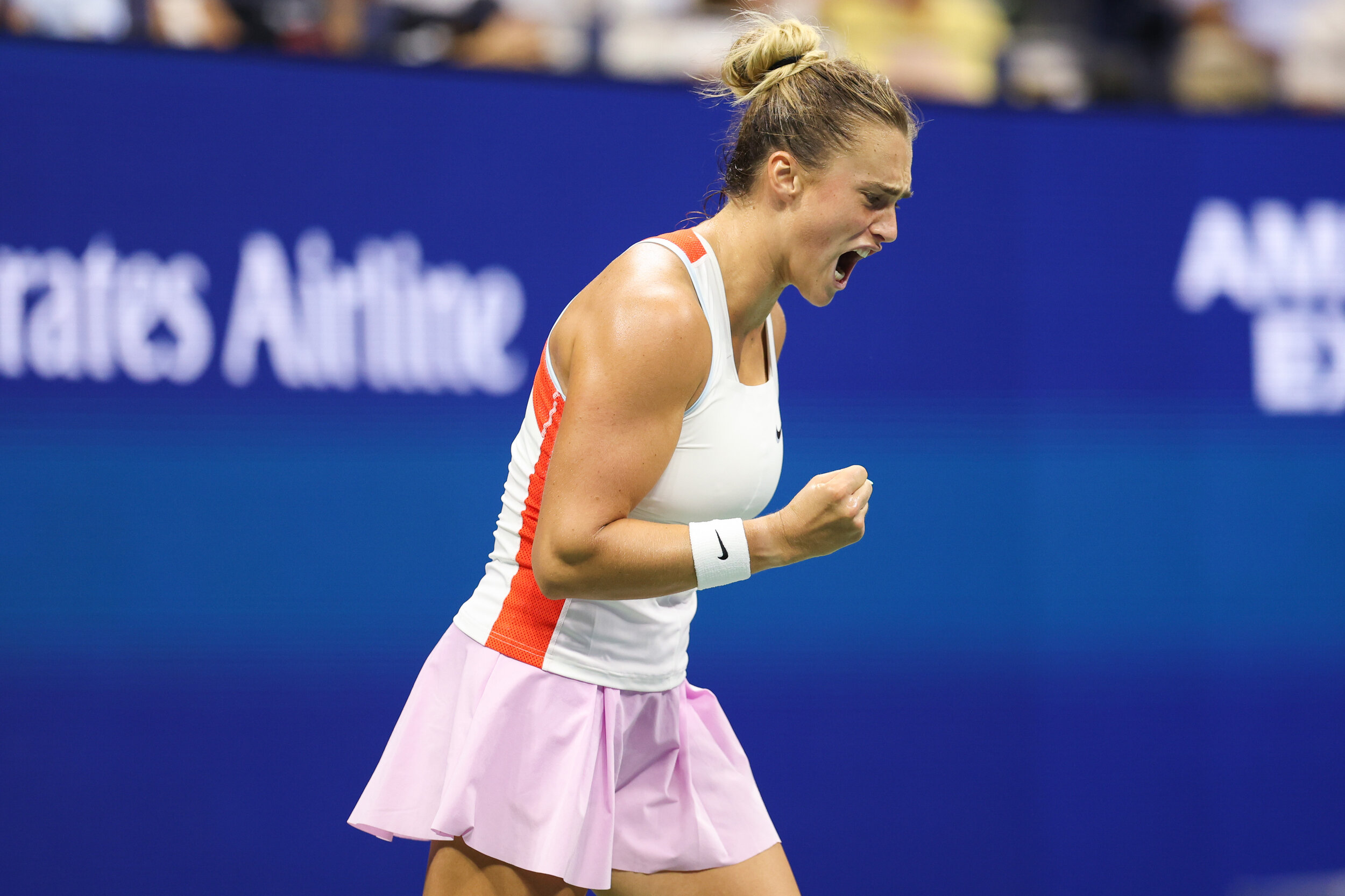 Aryna Sabalenka reacts during a women's singles match at the 2022 US Open, Monday, Sep. 5, 2022 in Flushing, NY. (Brandon Todd/USTA)