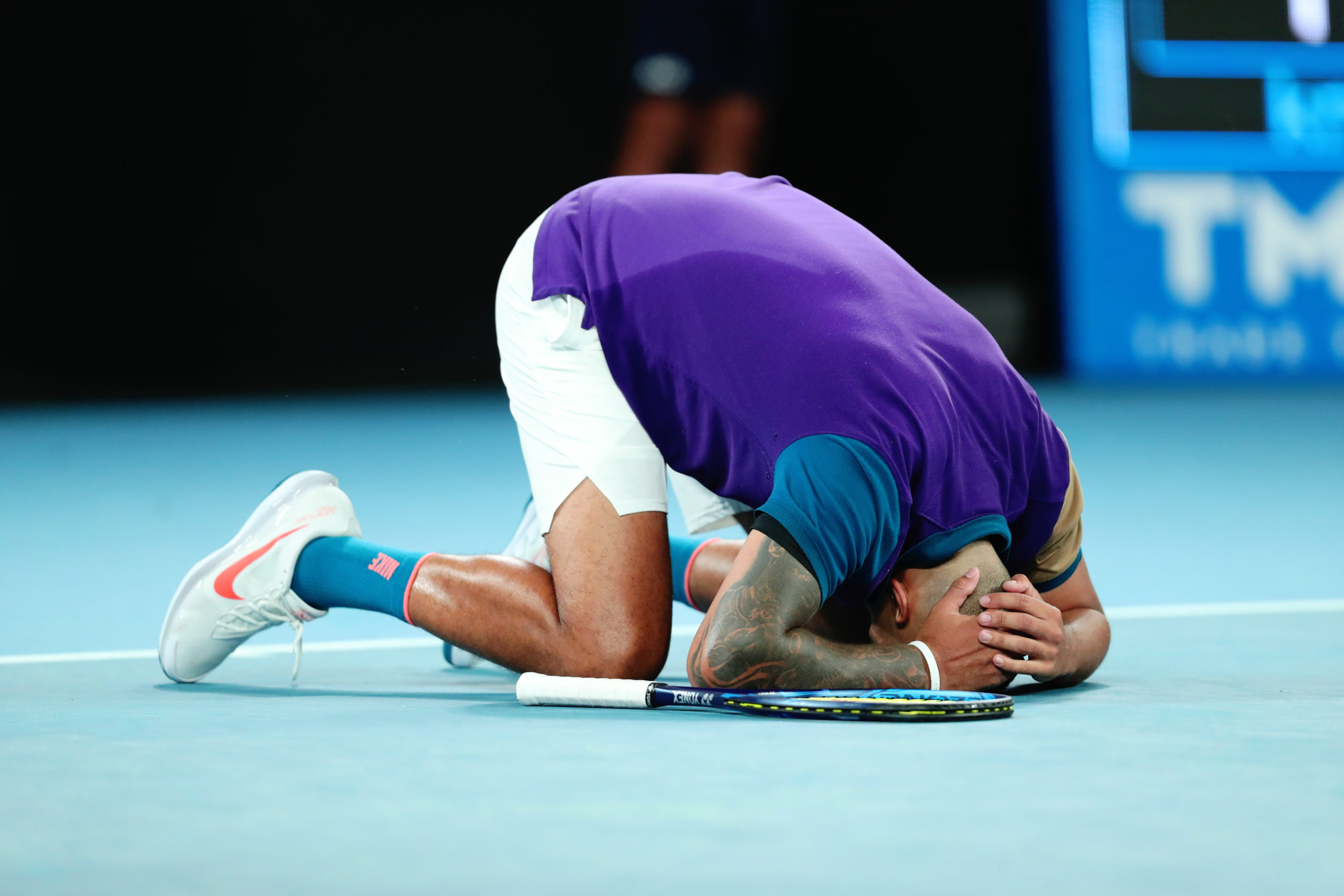 Nick KYRGIOS (AUS) celebrates after his match against Ugo HUMBERT (FRA) on John Cain Arena during Day 3 of the Australian Open at Melbourne Park on Wednesday, February 10, 2021. MANDATORY PHOTO CREDIT Tennis Australia/ MARK PETERSON