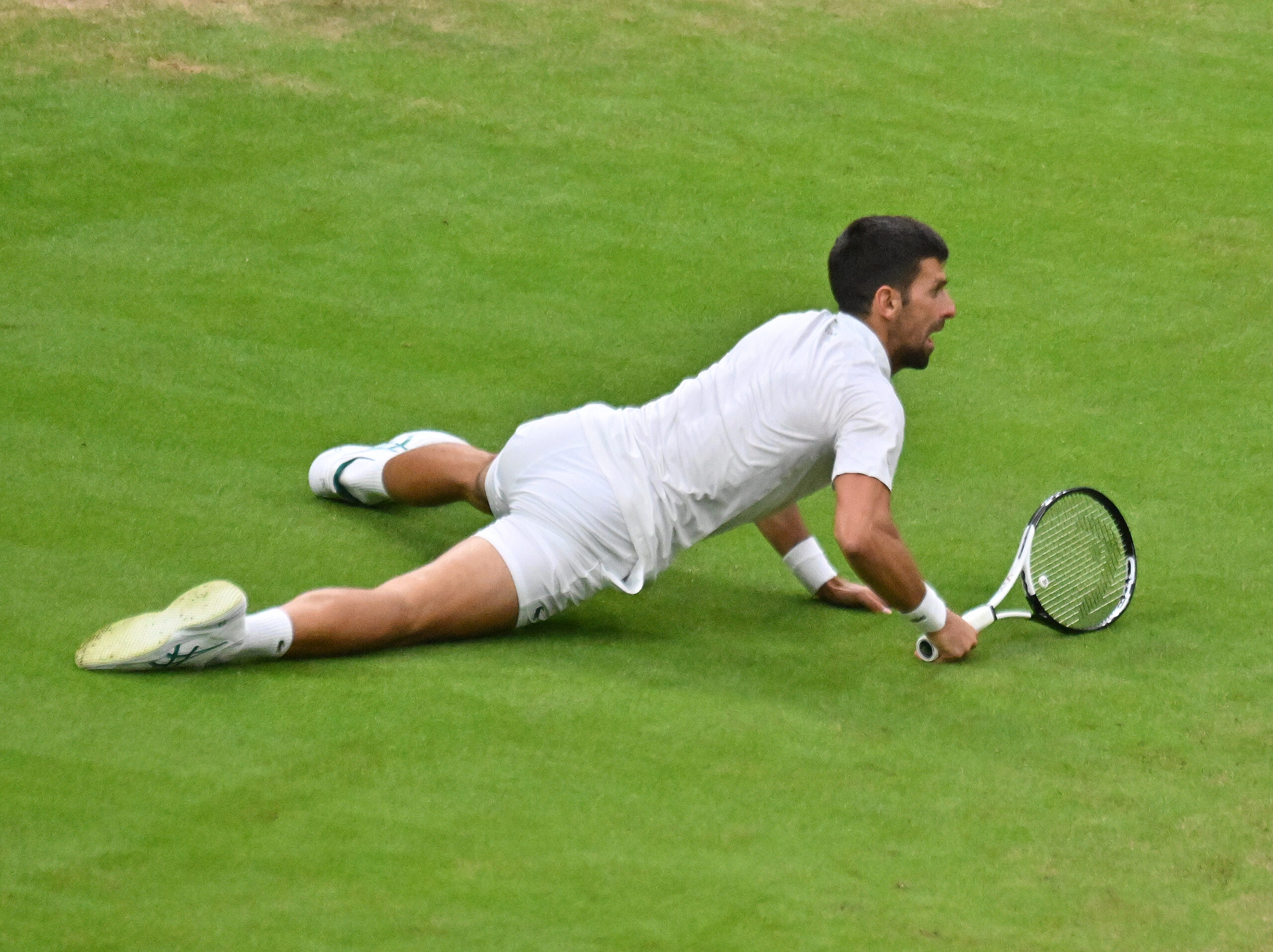 London Wimbledon Championships Day 12 14/07/2023 Down but not out - Novak Djokovic (SRB) slips during semi final victory Photo Roger Parker International Sports Fotos Ltd