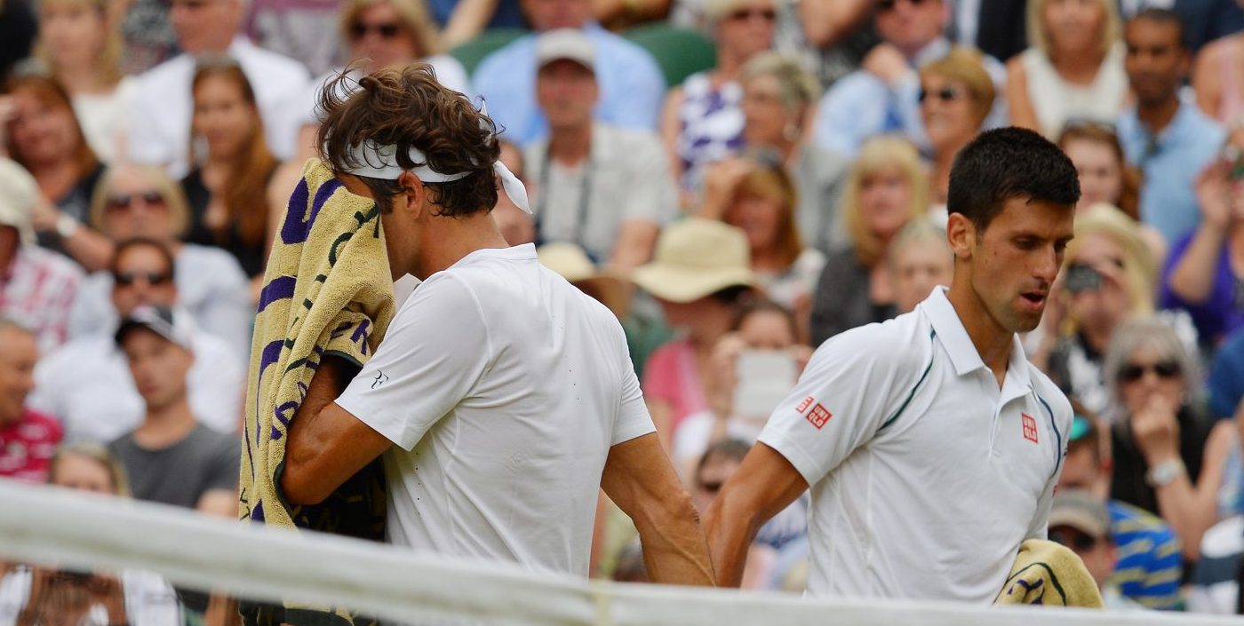 The Wimbledon Championships 2015 Day 13 12/07/2015 Novak Djokovic (SRB)and Roger Federer change ends in Mens Signles Final Photo Anne Parker International Sports Fotos