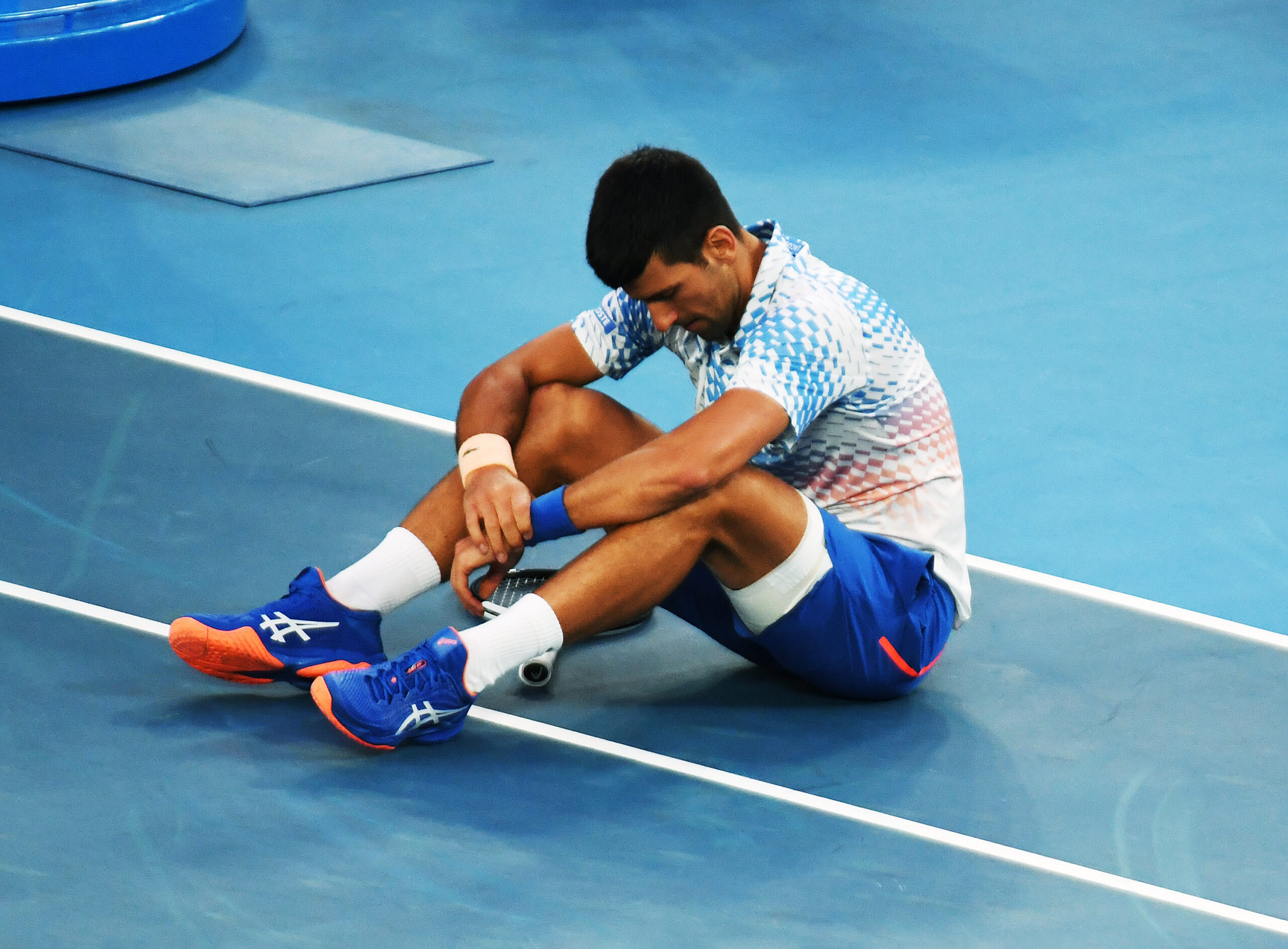 Australian Open 2023 Melbourne Park Day 6 21/01/2023 Novak Djokovic (SRB) takes a dive as he wins first set. in third round match Photo Roger Parker International Sports Fotos Ltd