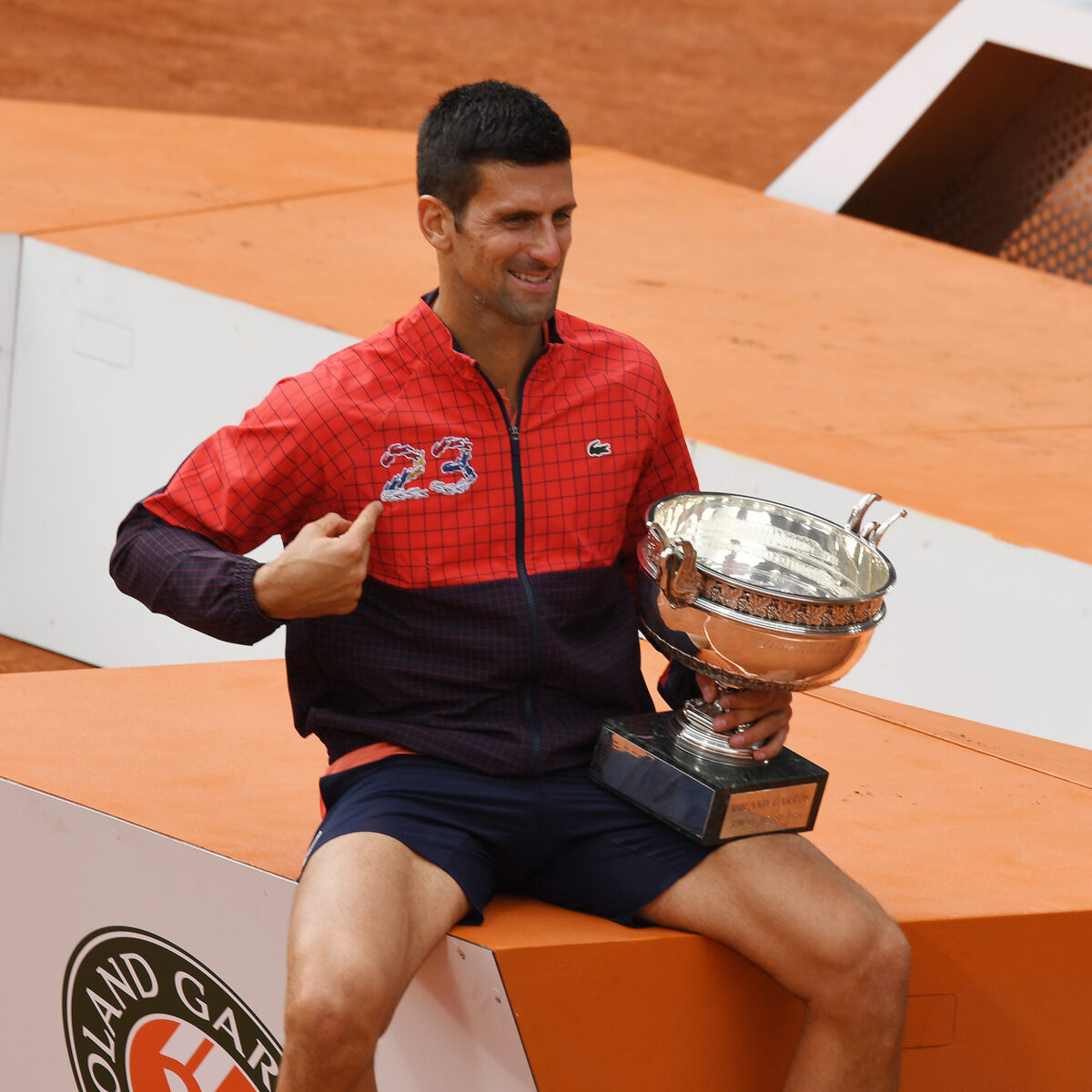 Main photo:- Roland Garros French Open 2023 Novak Djokovic with Coupe des Mousquetaires trophy after wins Men’s singles Final, a record 23 grand slams by Photo Roger Parker International Sports Fotos Ltd