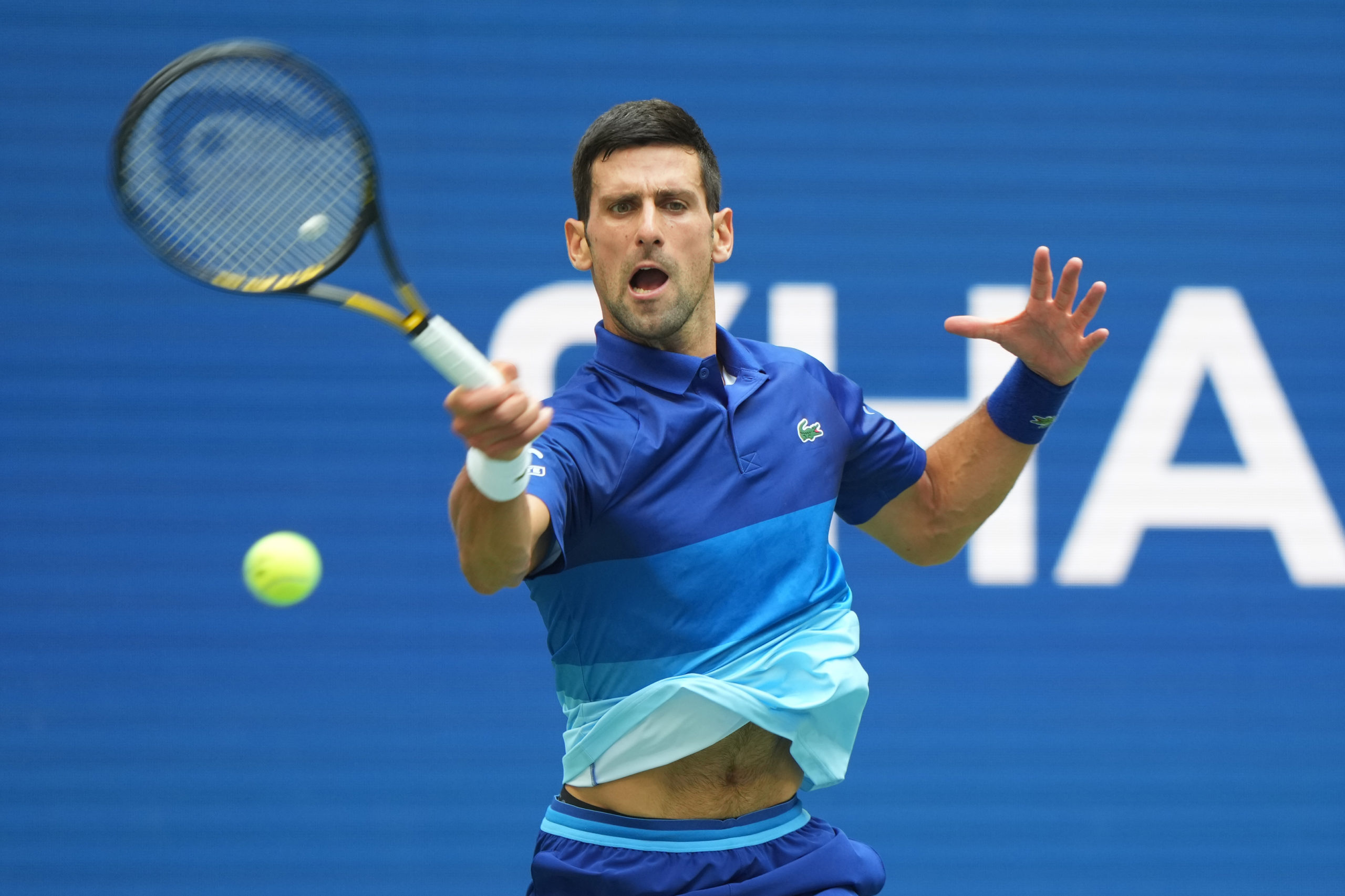 Novak Djokovic hits a forehand during the Men's Singles championship match at the 2021 US Open, Sunday, Sep. 12, 2021 in Flushing, NY. (Darren Carroll/USTA)