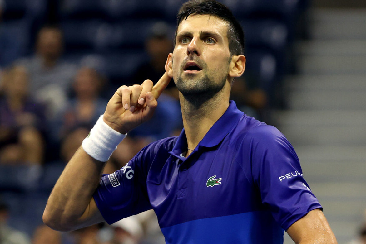 Novak Djokovic reacts during a Men's Singles quarterfinal match at the 2021 US Open, Wednesday, Sep. 8, 2021 in Flushing, NY. (Jed Jacobsohn/USTA)