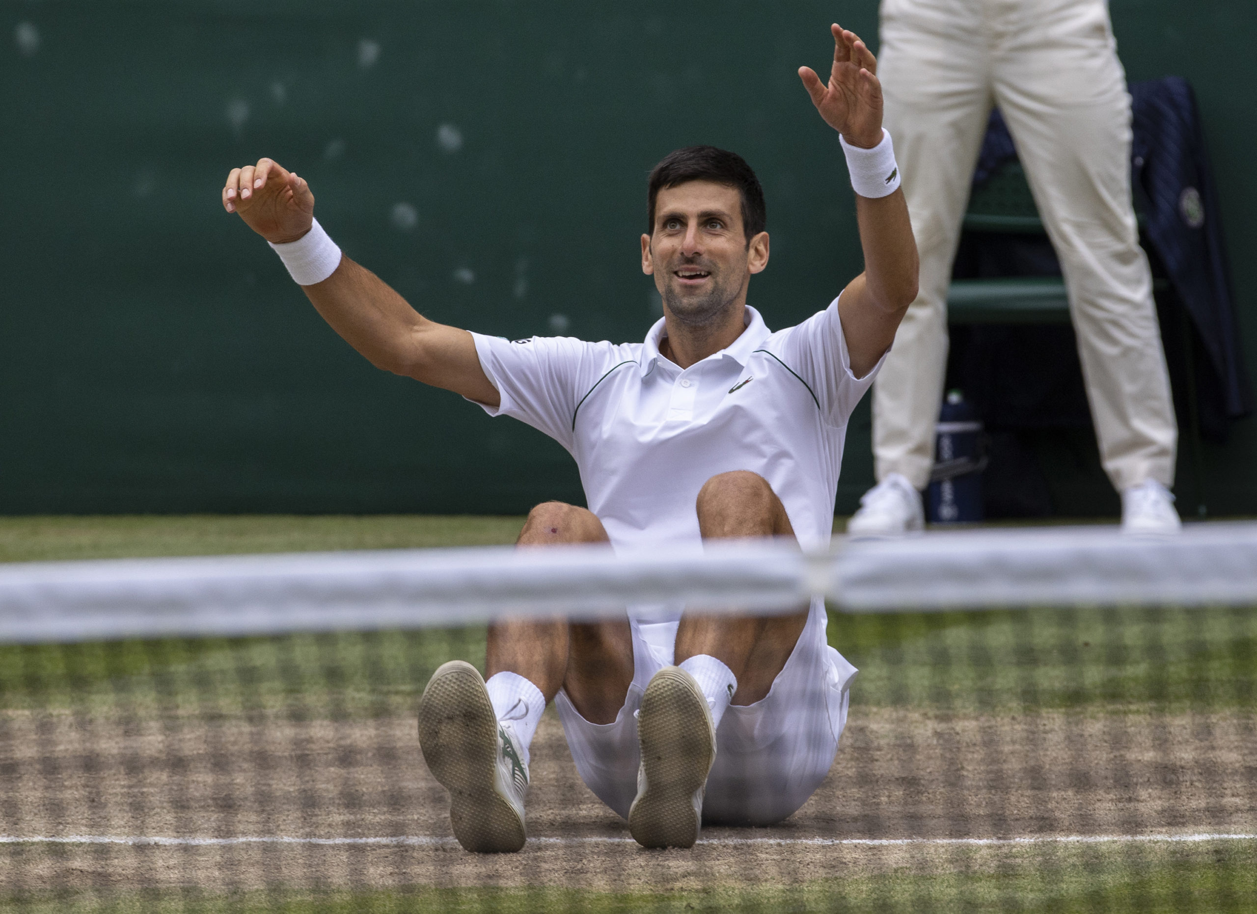 Novak Djokovic (SRB) falls to the ground after defeating Matteo Berrettini (ITA) in the final of the Gentlemen's Singles on Centre Court at The Championships 2021. Held at The All England Lawn Tennis Club, Wimbledon. Day 13 Sunday 11/07/2021. Credit: AELTC/David Gray