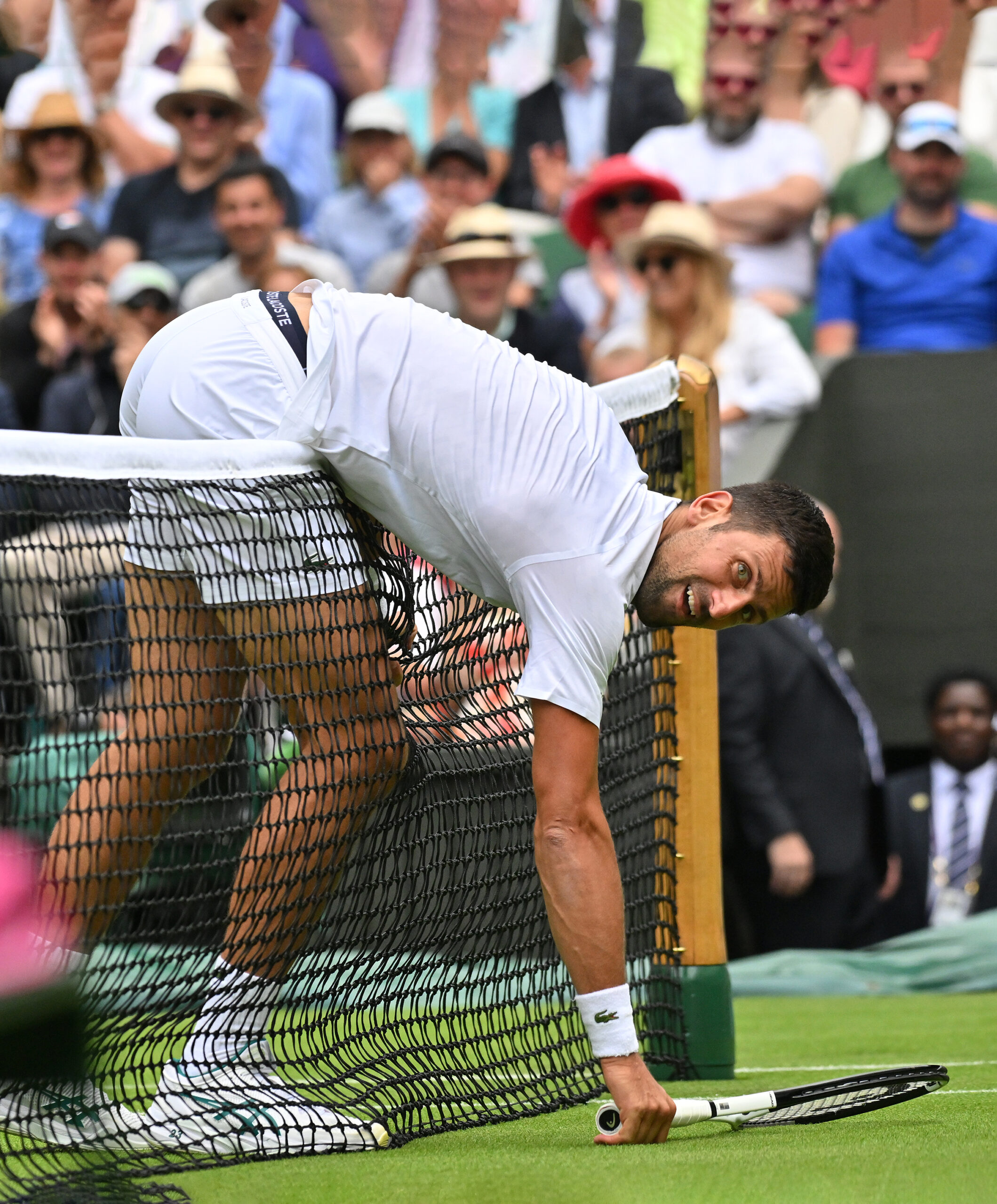 London Wimbledon Championships Day 1 03//07/2023 Novak Djokovic (SRB) takes a tumble over the net during first round match. Photo Roger Parker International Sports Fotos Ltd