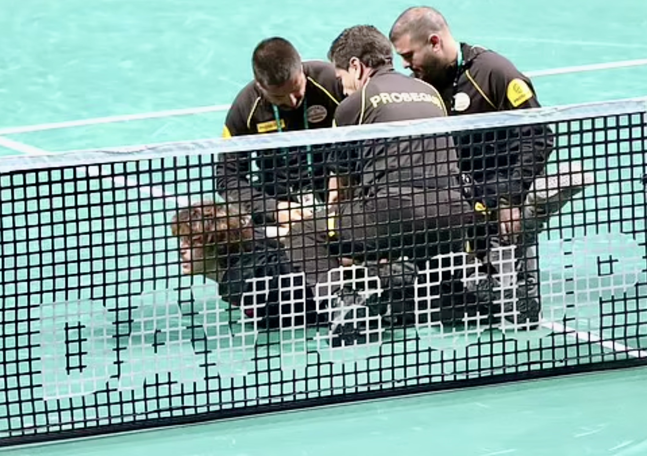 Five security guards quickly grabbed the pair as they tried to grab onto the net.