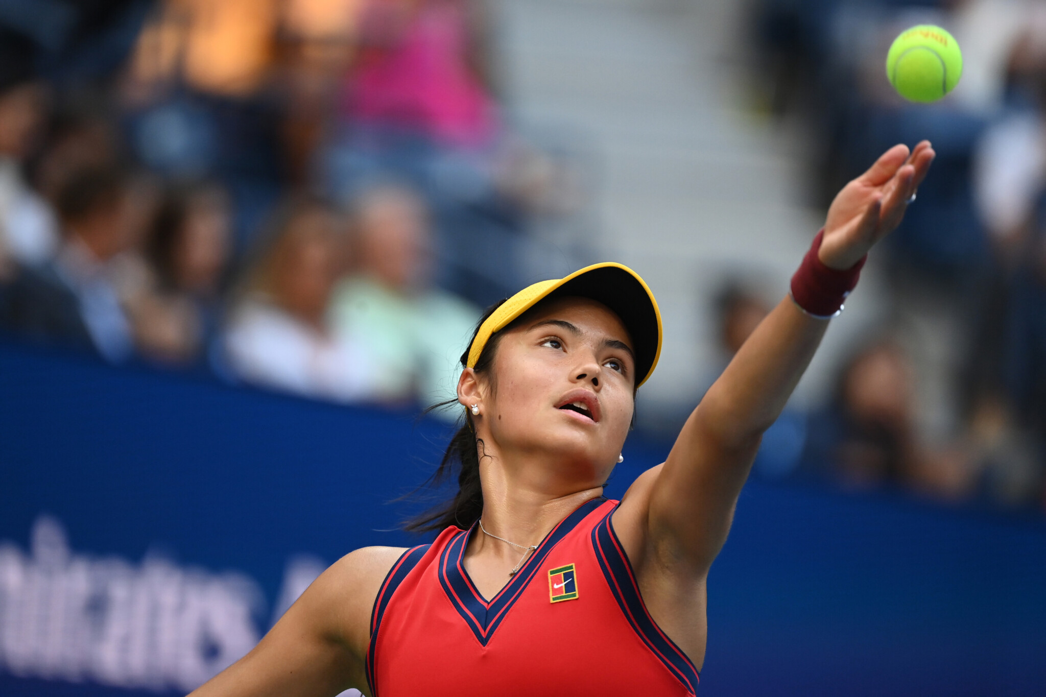 Emma Raducanu serves during the Women's Singles championship match at the 2021 US Open, Saturday, Sep. 11, 2021 in Flushing, NY. (Garrett Ellwood/USTA)
