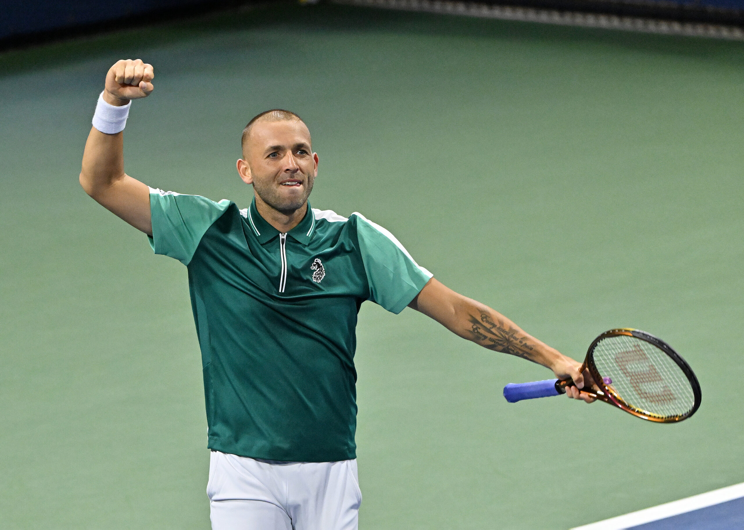 US Open Flushing Meadows 31//08/2023 Day 4 Dan Evans (GBR) celebrates as he wins second round match having lost the first set 1-6. Photo Roger Parker International Sports Fotos Ltd Photo Roger Parker International Sports Fotos Ltd