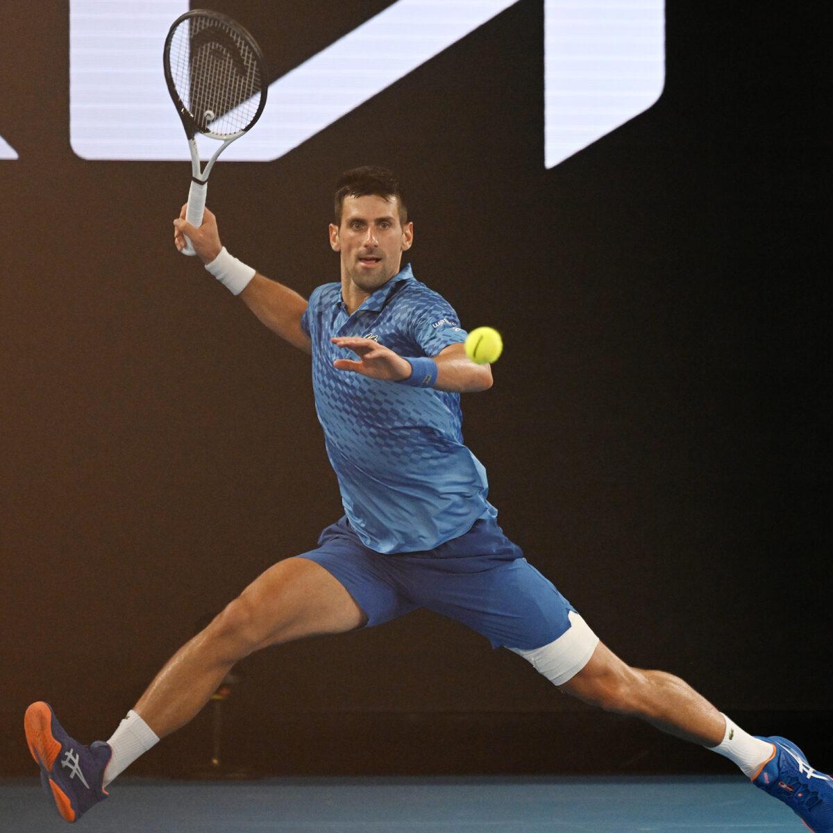 Main photo:- Australian Open 2023 Novak Djokovic at full stretch in semi-final whilst carrying thigh injury – Photo Roger Parker International Sports Fotos Ltd