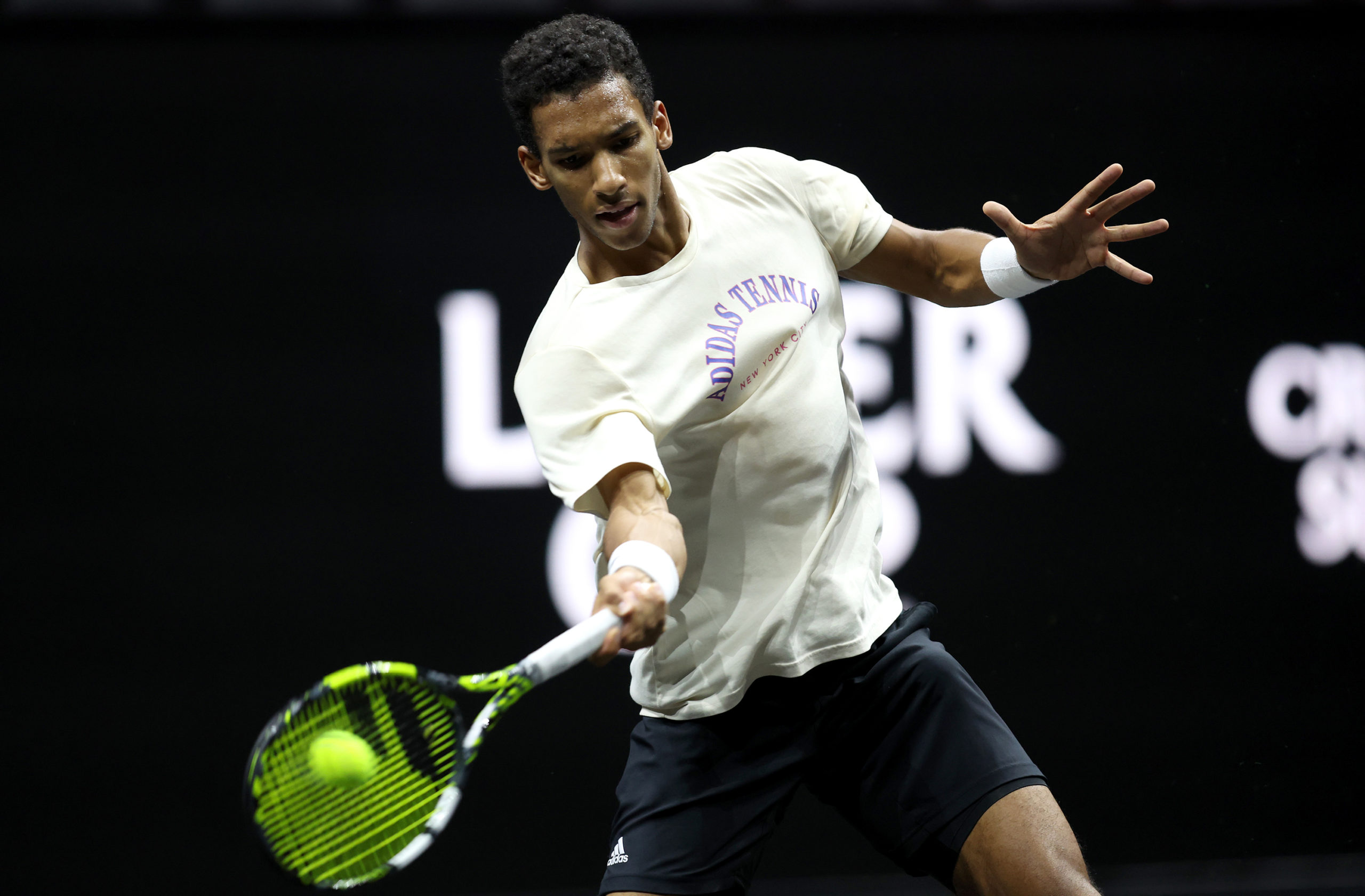 LONDON, ENGLAND - SEPTEMBER 20: Felix Auger-Aliassime of Team World plays a forehand during a practice ahead of the Laver Cup at The O2 Arena on September 20, 2022 in London, England. (Photo by Julian Finney/Getty Images for Laver Cup)