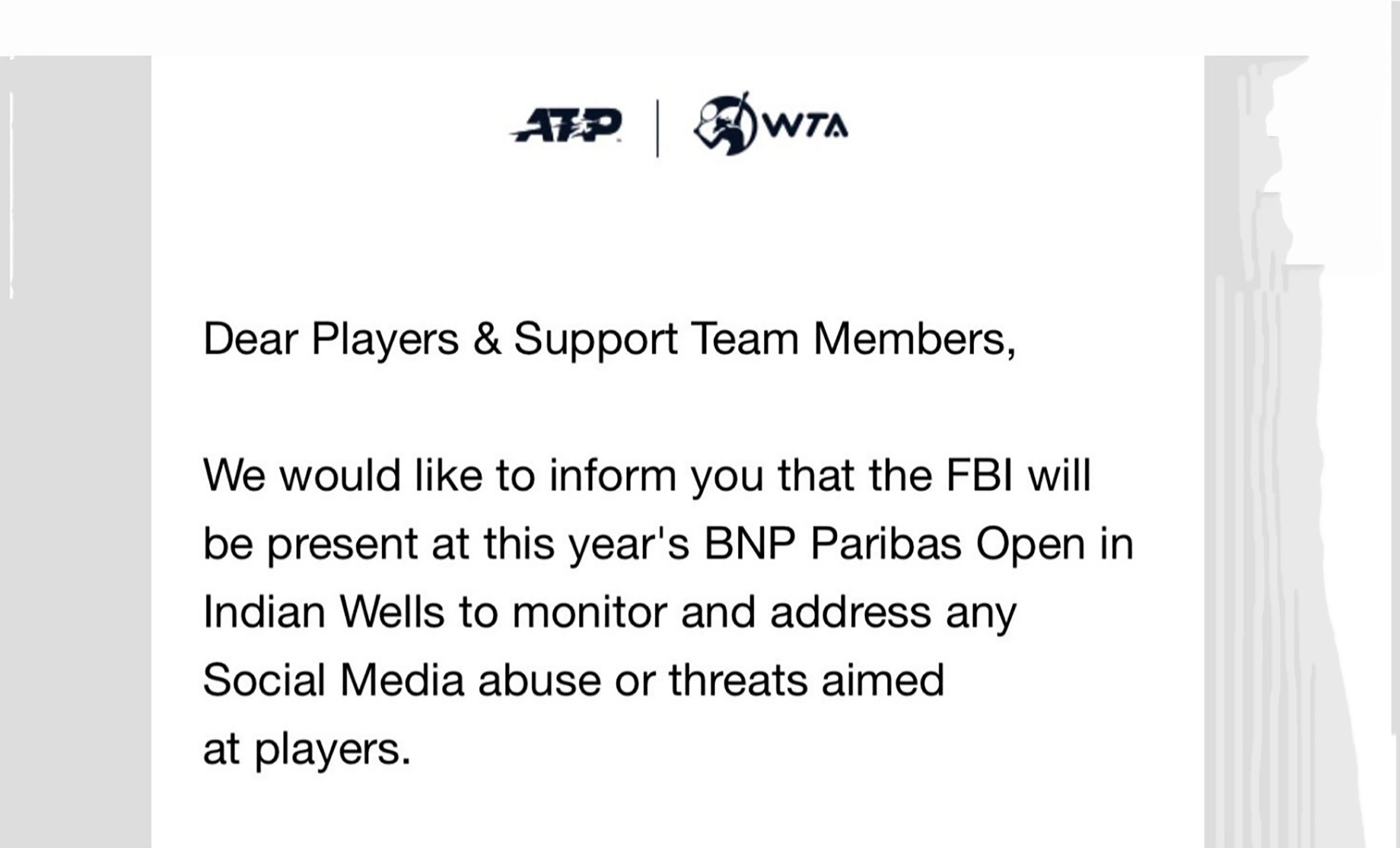 The ATP and WTA have informed all their players in a memo sent to both those involved and support team members that the FBI will be present at the BNP Masters in Indian Wells in order to monitor social media abuse aimed at players