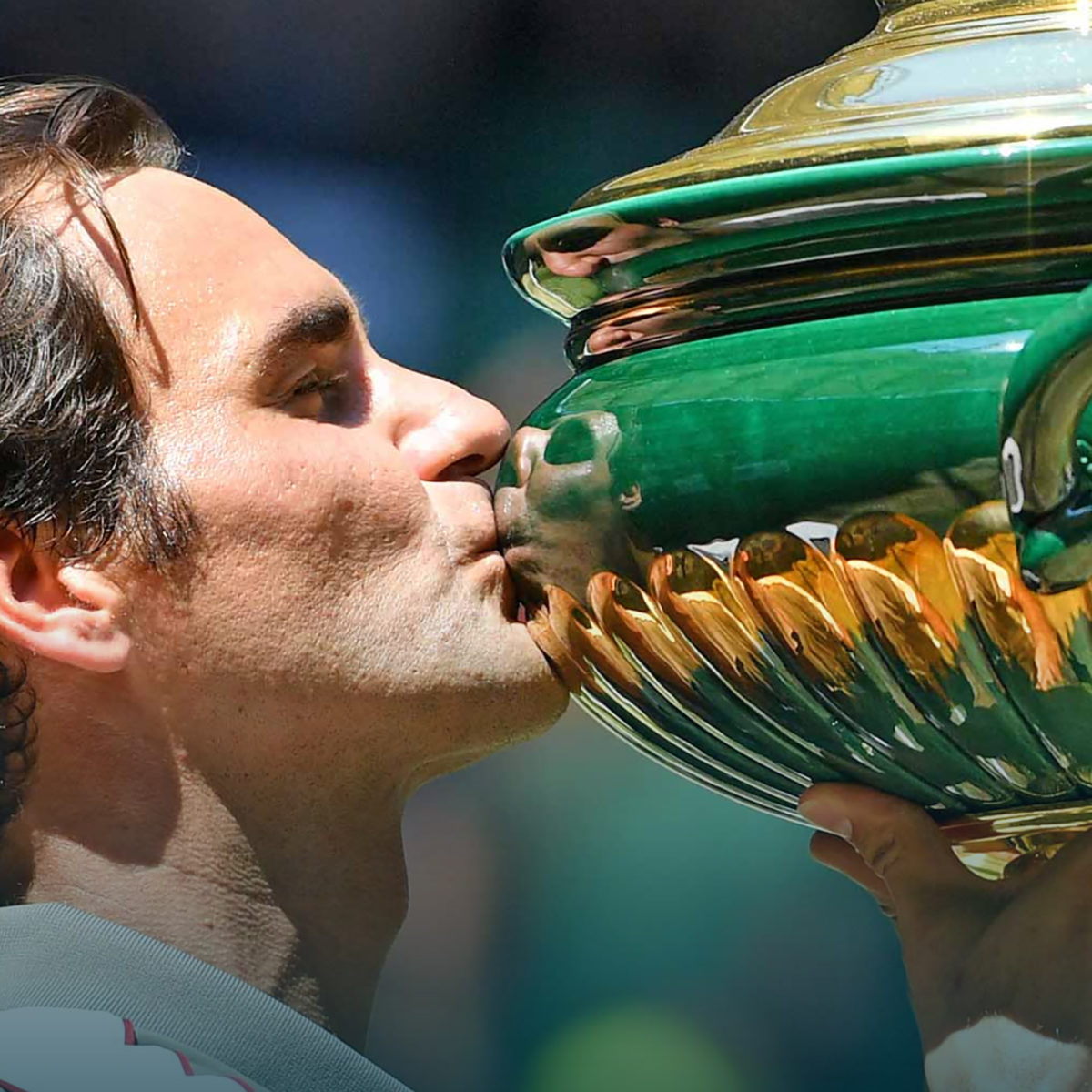 Main photo:- Roger Federer with his 10th Halle trophy – by ATPTour.com
