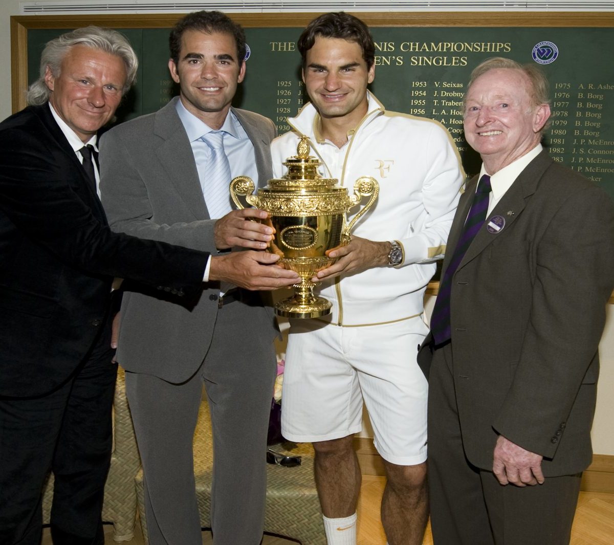 The Championships Wimbledon 2009 Roger Federer after he wins his 15th Grand Slam 16-14 in 5th set with Pete Sampras, holder of 14 titles, Bjorn Borg and Rod Laver . It was the longest Grand Slam final ever in terms of Games Photo: Bob Martin / AELTC Pool /Fotosports International