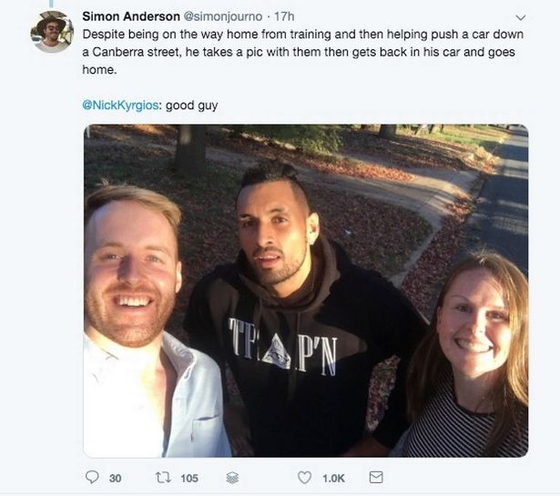 “Despite being on the way home from training and then helping push a car down a Canberra street, he takes a pic with them and then gets back in the car and goes home. Nick Kyrgios: good guy.”