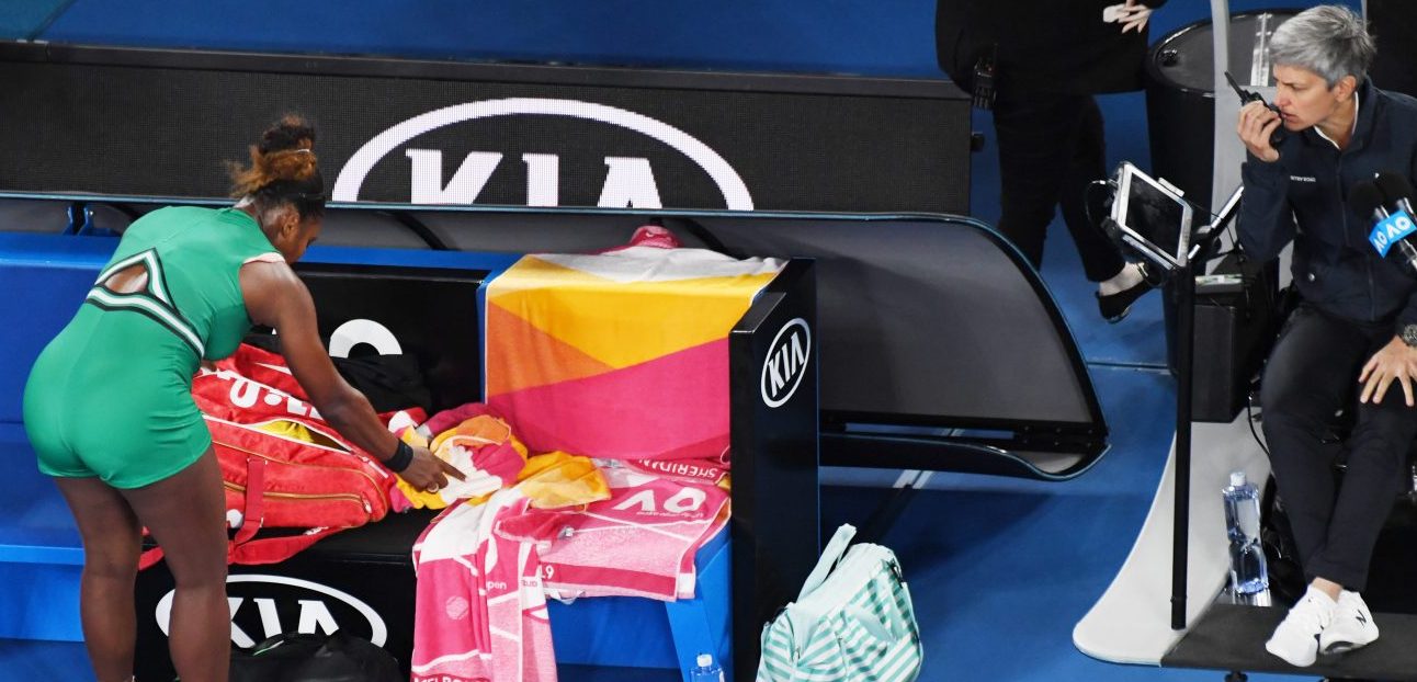 Serena Williams, having just beaten Simona Halep in a fourth round match performs her well rehearsed “how to make five towels disappear” trick by stuffing them into her Wilson racket bag.