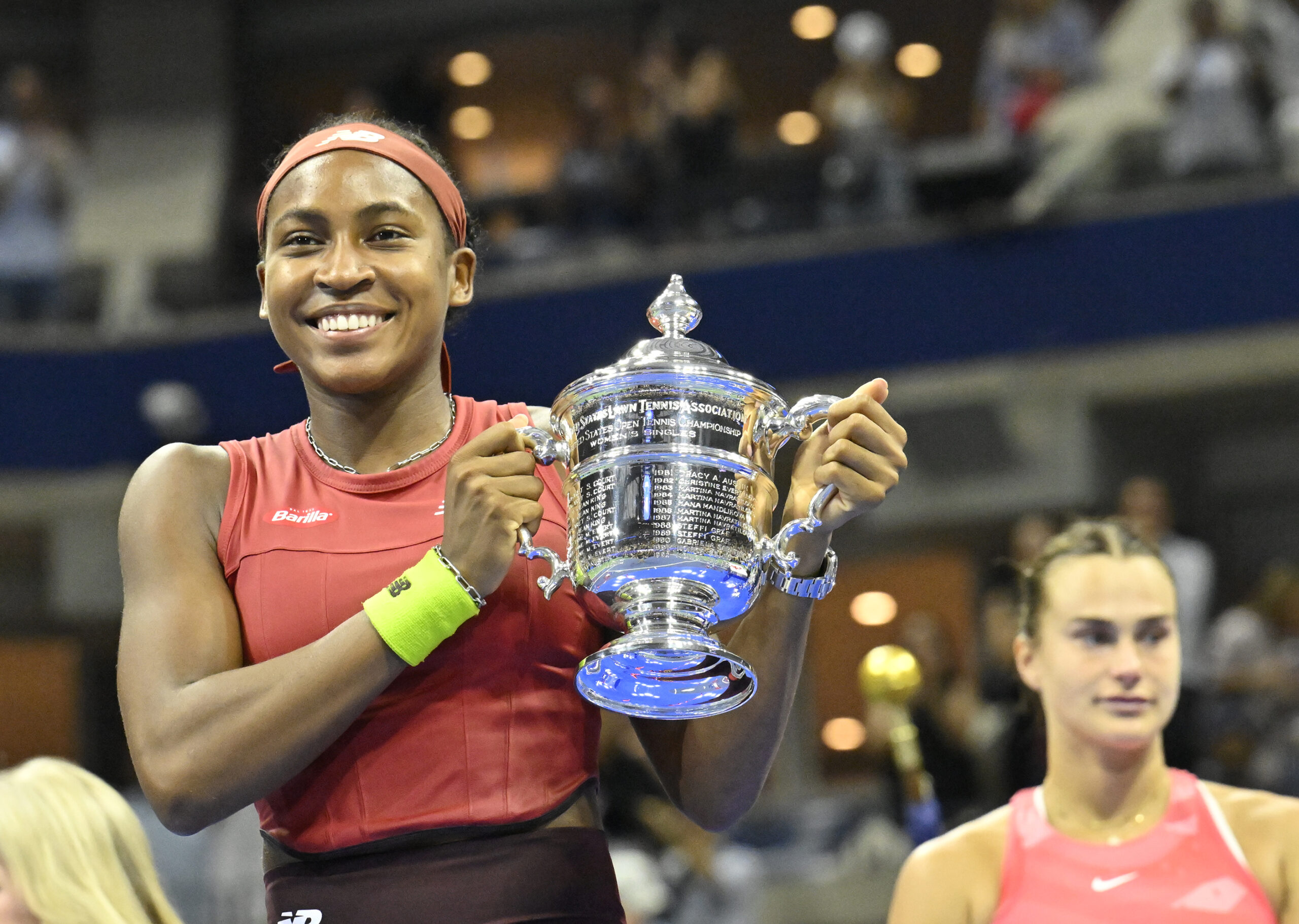US Open Flushing Meadows New York 09/09/2023 Day 13 COCO GAUFF (USA) wins her first Grand Slam and celebrates with the trophy Photo Roger Parker International Sports Fotos Ltd