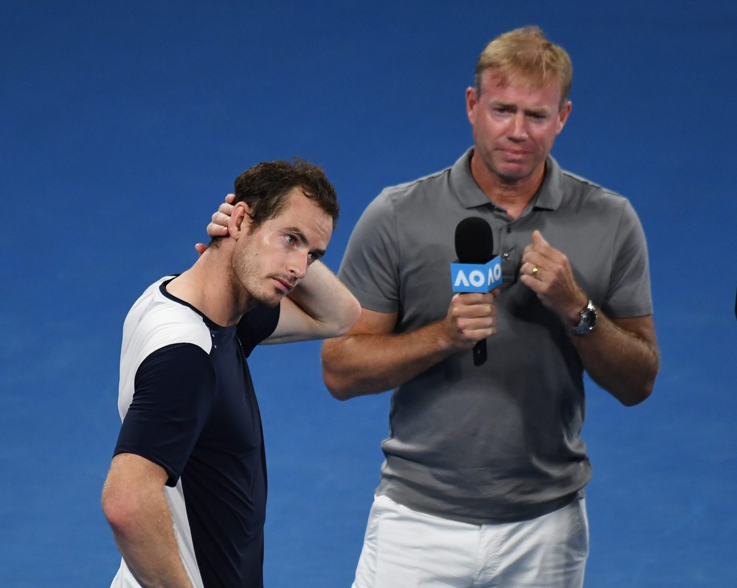 Melbourne Park Australian Open 2019 Day 1 14/01/2019 Braveheart's last stand? Andy Murray (GBR) goes five sets before bowing out on maybe his last Australian Open and Grand slam is interviewed on court by his first coach Mark Petchey Photo Roger Parker International Sports Fotos Ltd https://www.grandslamtennis.online