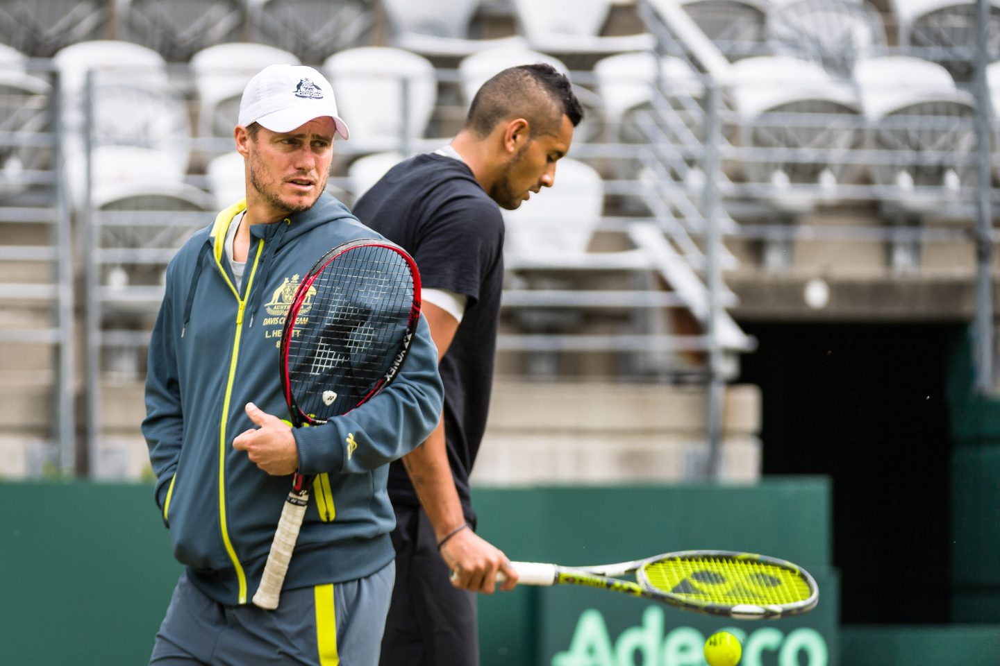 Nick KYRGIOS & Captain Leyton HEWITT practicing at Davis Cup World Group Play-off tie between Australia and Slovakia at Ken Rosewall Arena, Homebush Tennis Centre, Sydney, Australia. 15 September 2016. ©Andy Cheung/ArcK Images/International Sports Fotos