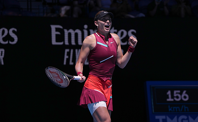 Paula BADOSA (ESP) celebrates her win during Round 2 of the Australian Open on Rod Laver Arena at Melbourne Park in Melbourne on Wednesday, January 19, 2022. MANDATORY PHOTO CREDIT Mark Dadswell/TENNIS AUSTRALIA