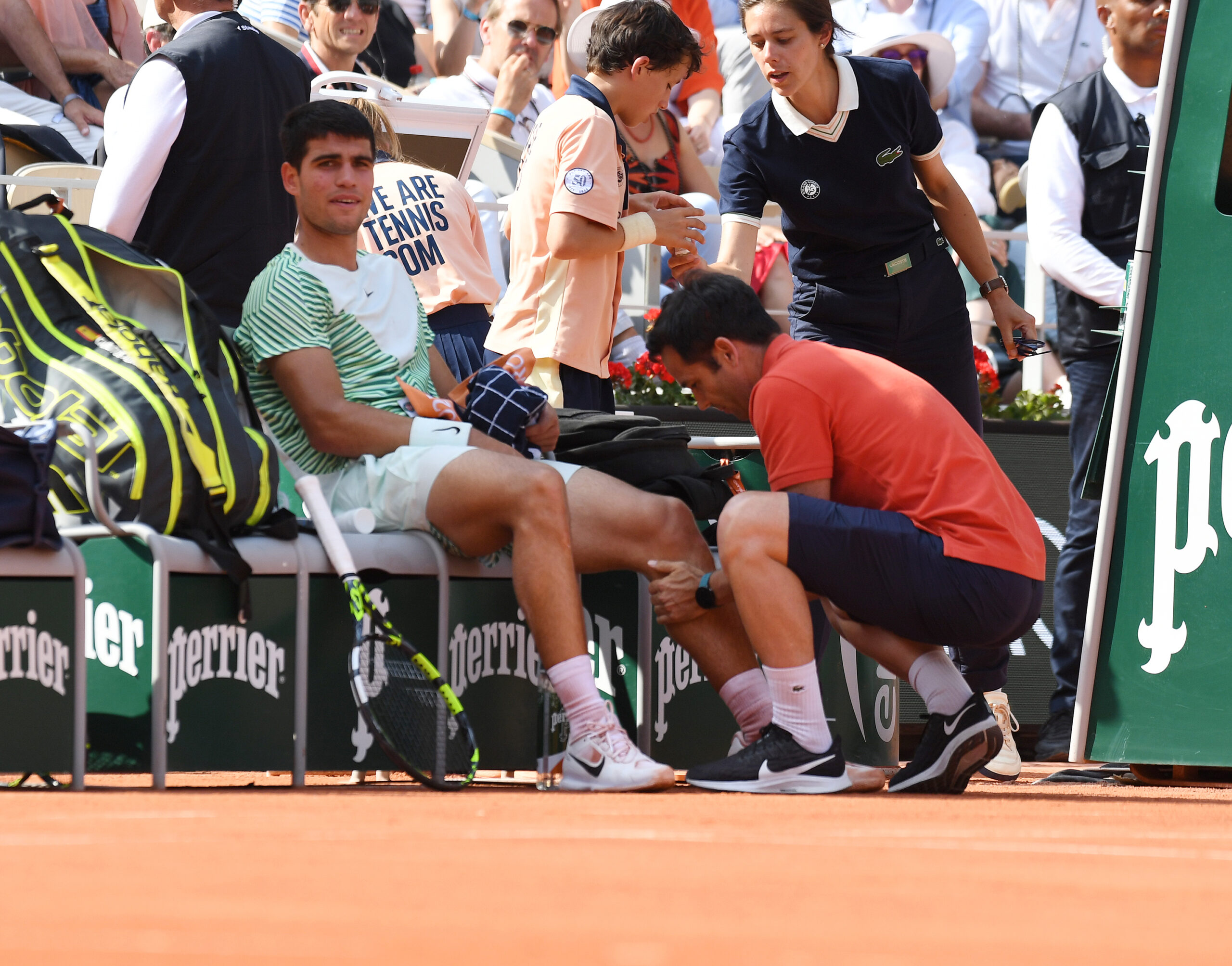 Main photo:-French Open 2023 Carlos Alcaraz (ESP) receives on court treatment for cramping in Men’s Semi-Final by Roger Parker International Sports Fotos Ltd