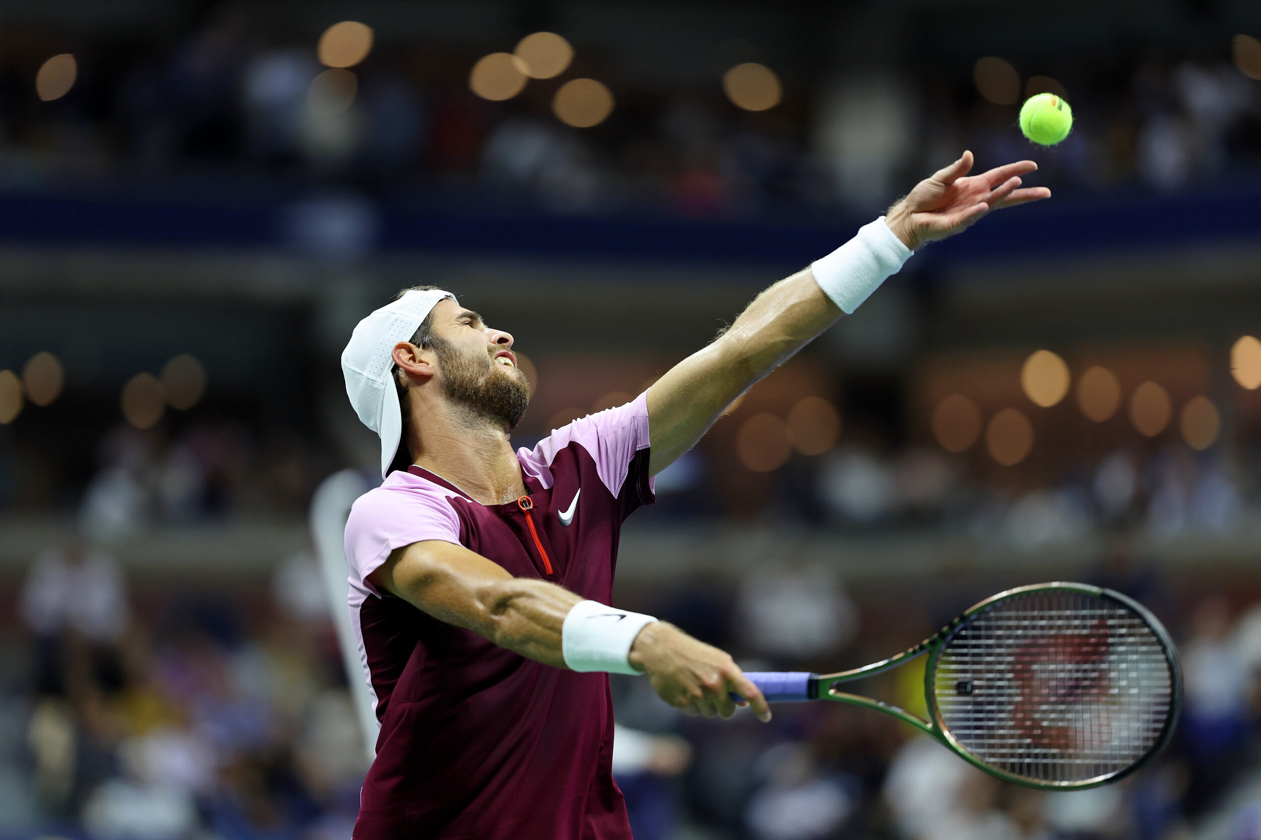 Karen Khachanov serves during a men's singles quarterfinal match at the 2022 US Open, Tuesday, Sep. 6, 2022 in Flushing, NY. (Simon Bruty/USTA)