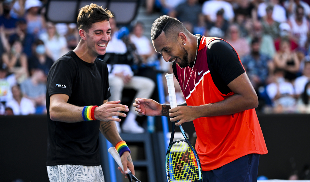 Thanasi Kokkinakis (left) and Nick Kyrgios of Australia react during the 3th round Mens Doubles match against Ariel Behar of Uruguay and Gonzalo Escobar of Ecuador on Day 7 of the Australian Open at Melbourne Park in Melbourne, Sunday, January 23, 2022. (AAP Image/Dave Hunt) NO ARCHIVING, EDITORIAL USE ONLY ** STRICTLY EDITORIAL USE ONLY, NO COMMERCIAL USE, NO BOOKS **