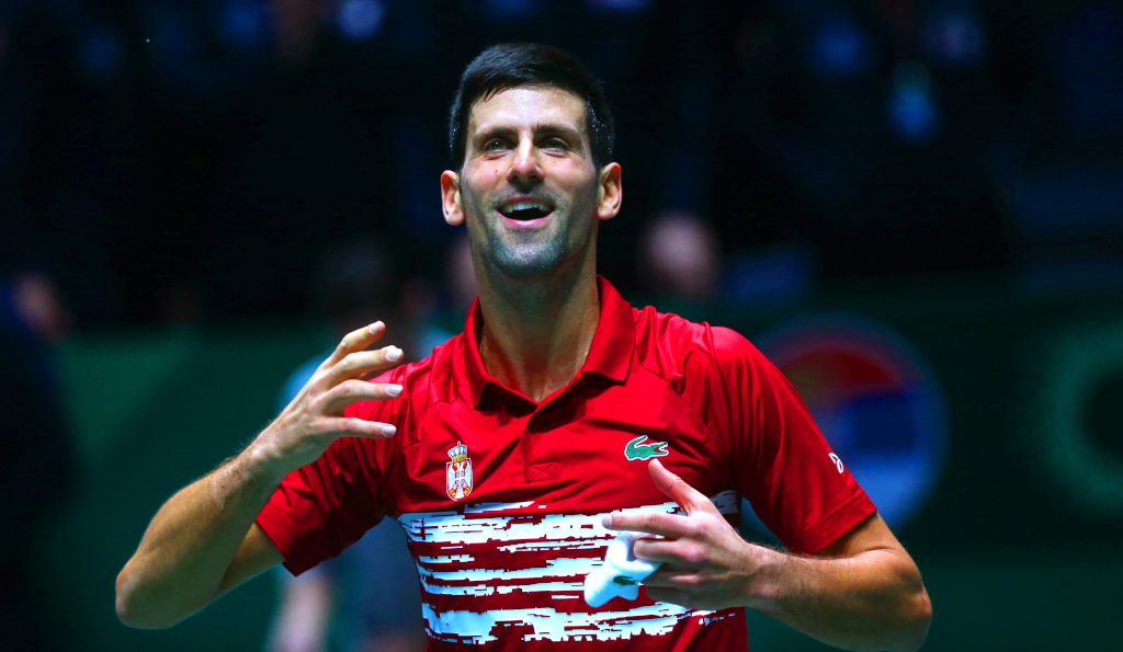 20 November 2019, Spain, Madrid: Tennis, Davis Cup, Group stage, Group A, Japan - Serbia, Individual, Nishioka (Japan) - Djokovic (Serbia). Novak Djokovic is cheering. Photo: Cezaro De Luca/dpa