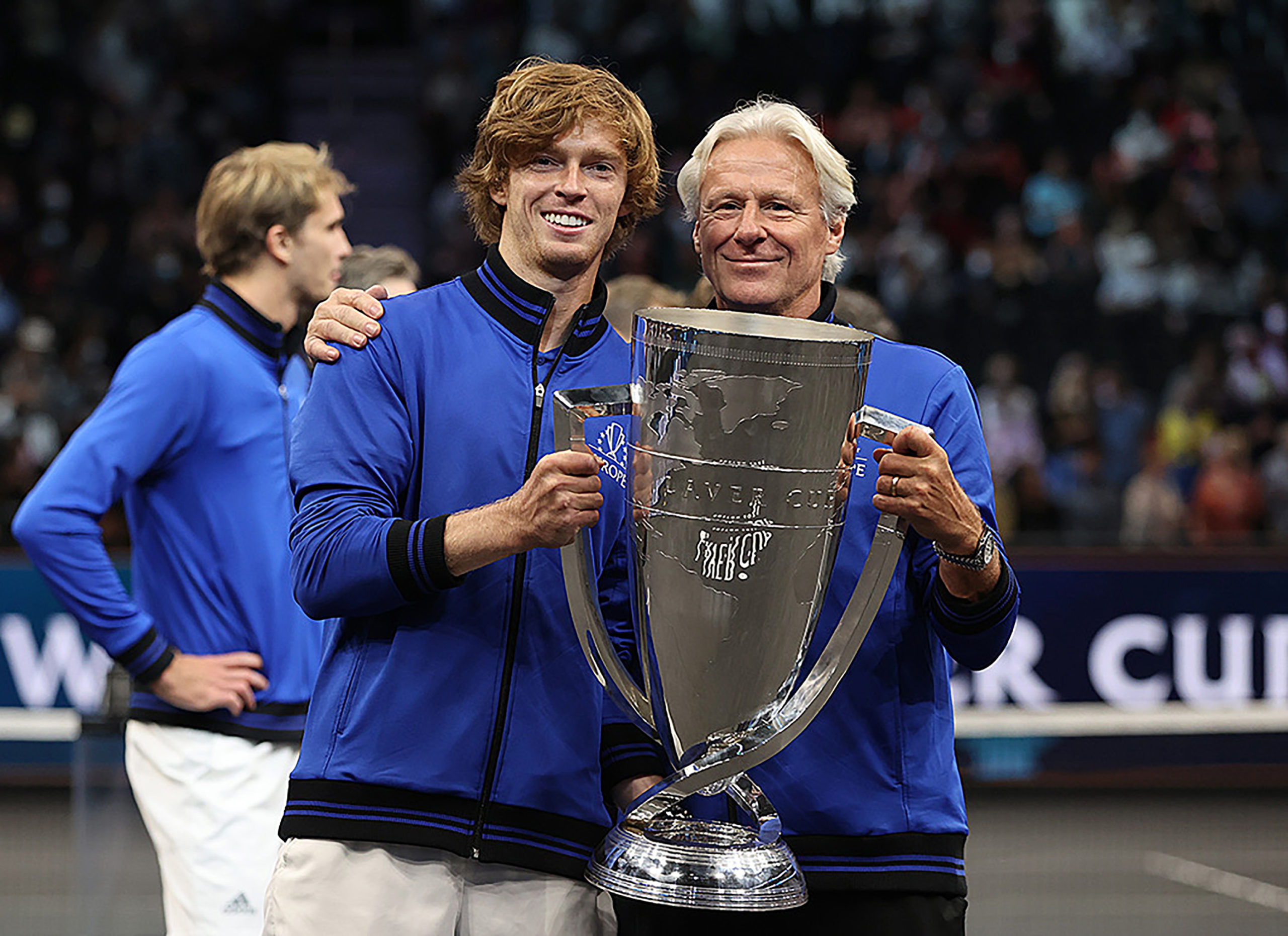 Main photo:- Laver Cup captain Bjorn Borg with Cup and Andry Rublev