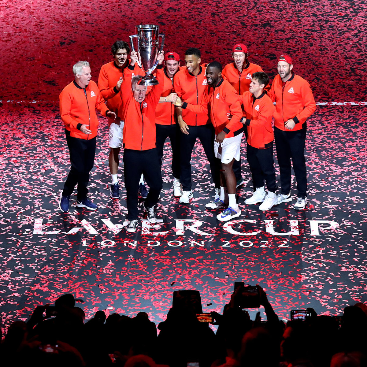Main photo:- John McEnroe, Captain of Team World celebrates with the Laver Cup trophy and team members O2 Arena 25/09/2022 in London by Lewis Storey/Getty for Laver Cup)