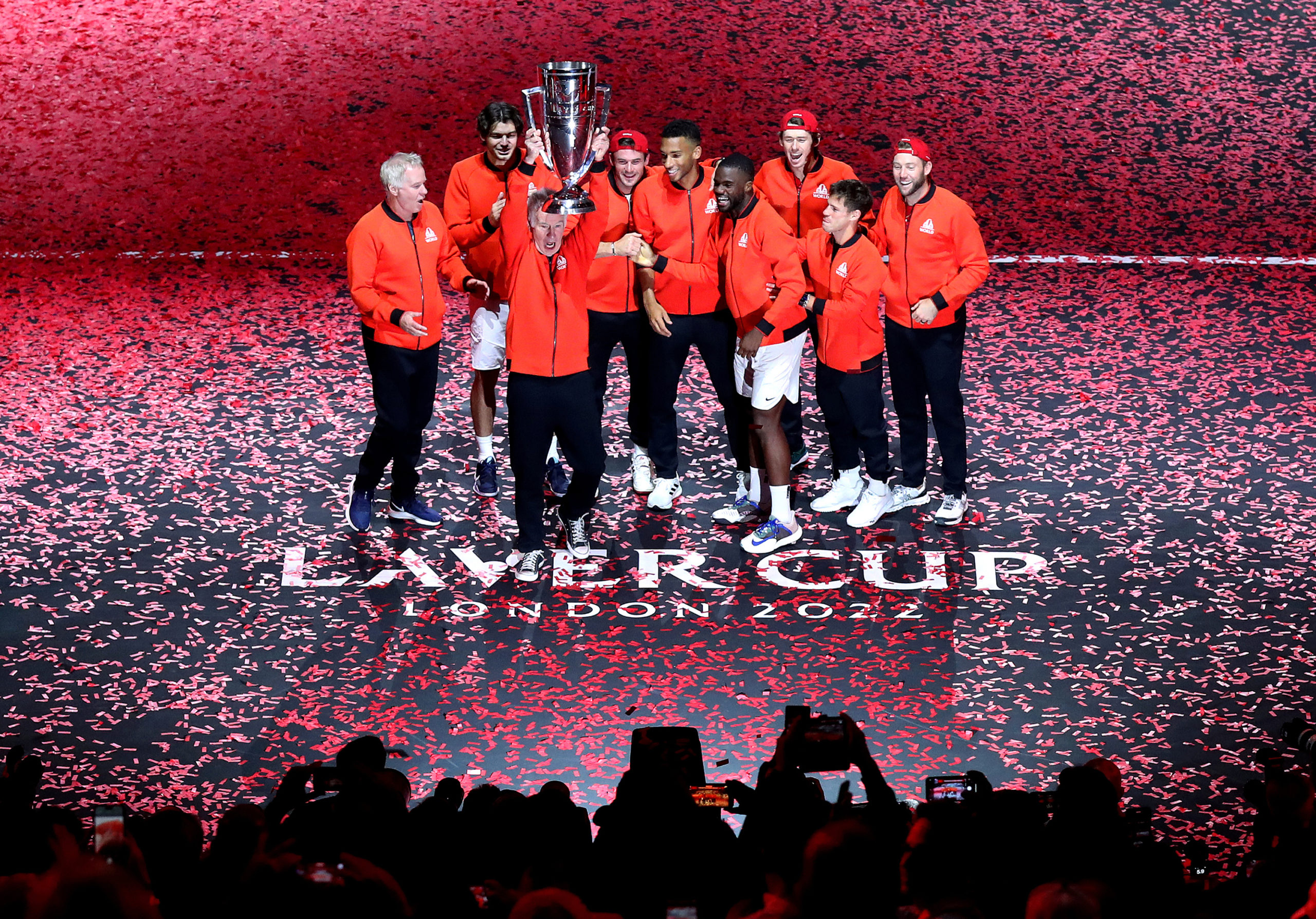 Main photo:- John McEnroe, Captain of Team World celebrates with the Laver Cup trophy and team members O2 Arena 25/09/2022 in London by Lewis Storey/Getty for Laver Cup)