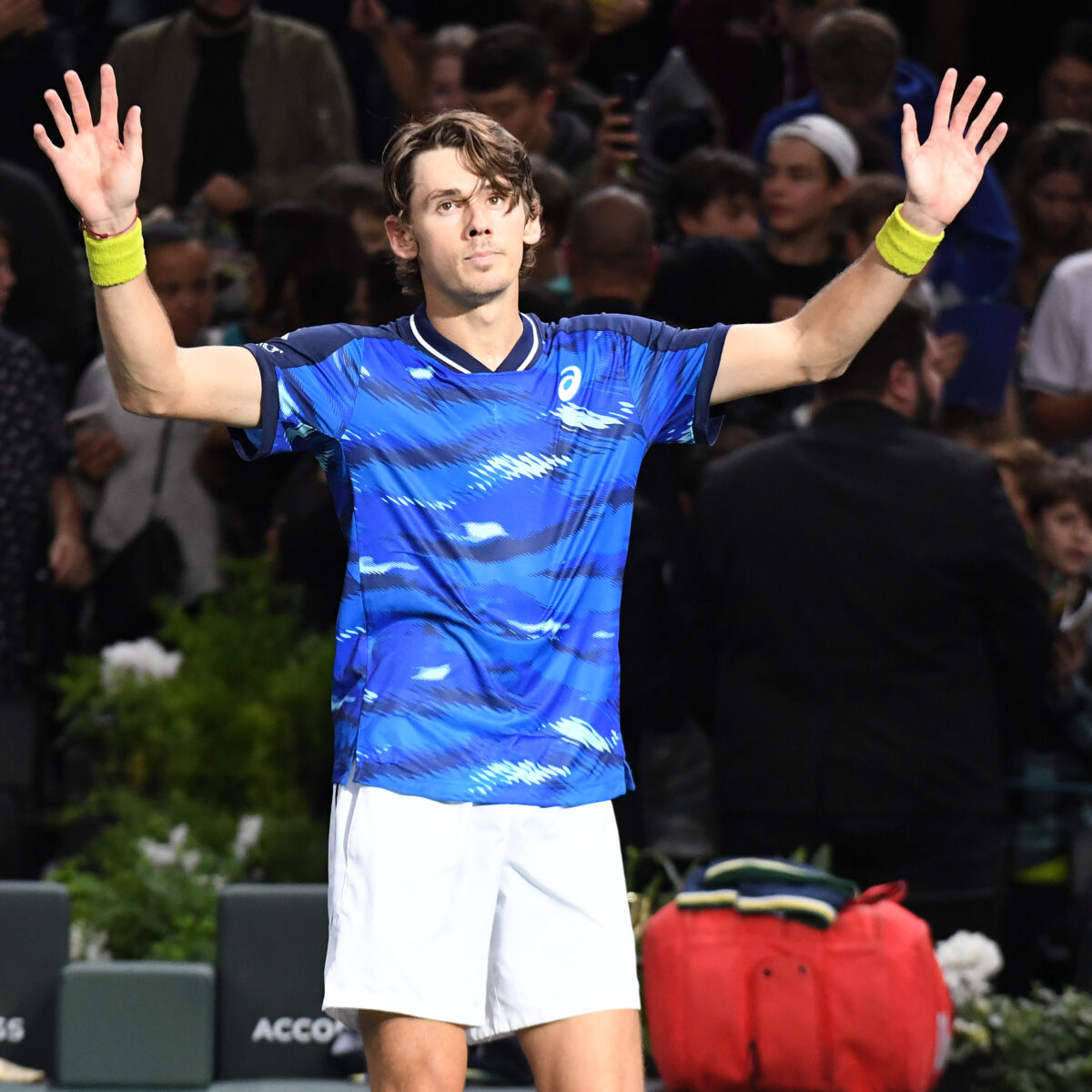 Main photo:- Alex de Minaur celebrates victory in second round match Rolex Paris Masters today – by Roger Parker International Sports Fotos Ltd
