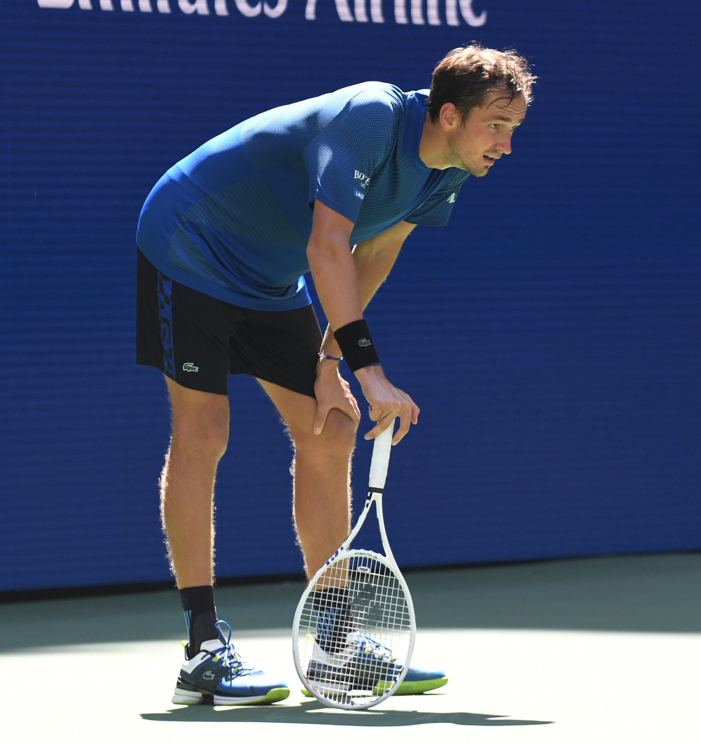 New York Flushing Meadows US Open Day 1 29/08/2022 Daniil Medvedev (xxx) takes a breather in the inrtense heat as hewins first round match Photo Roger Parker International Sports Fotos Ltd