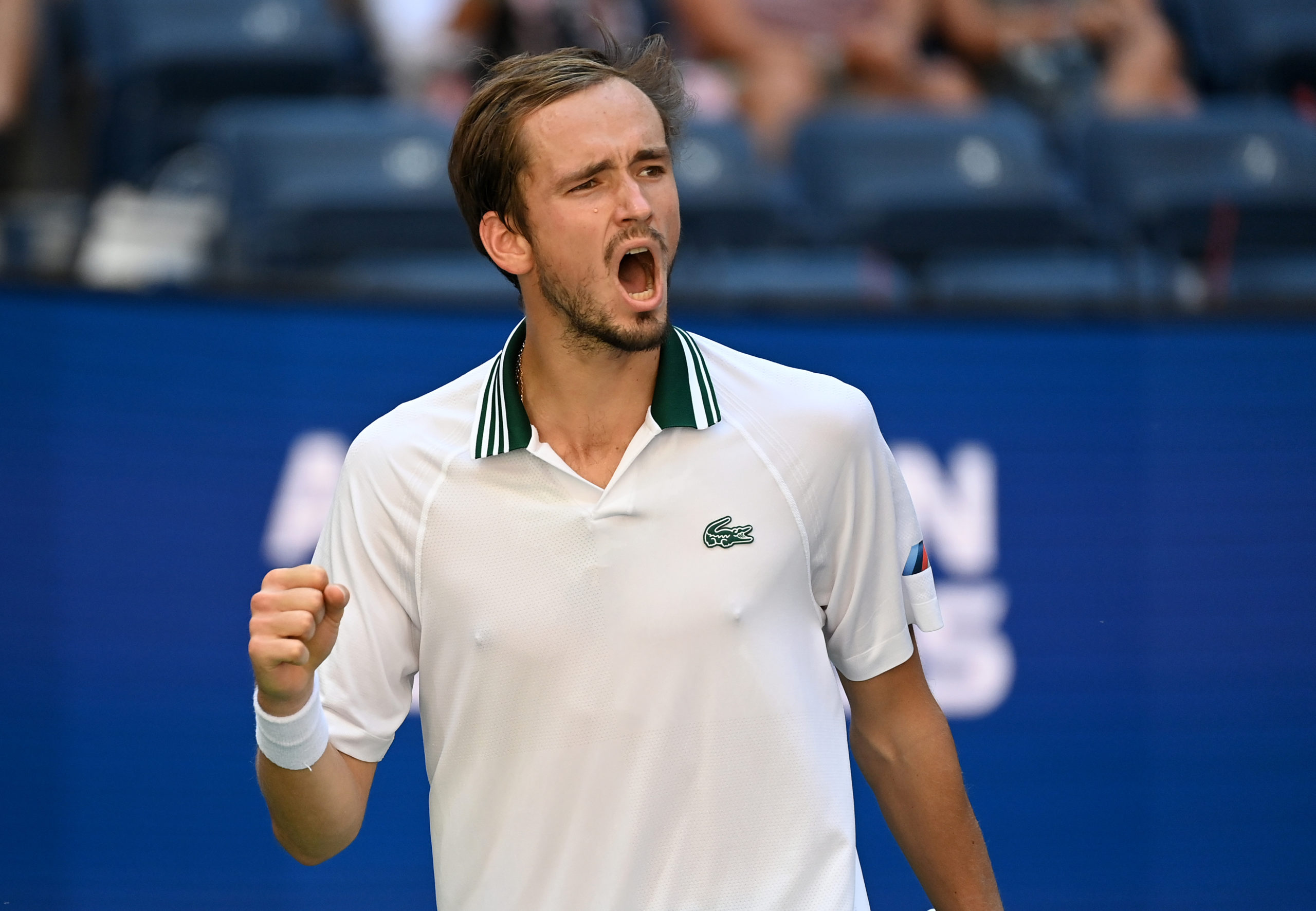 Daniil Medvedev reacts to winning a Men's Singles quarterfinal match at the 2021 US Open, Tuesday, Sep. 7, 2021 in Flushing, NY. (Garrett Ellwood/USTA)
